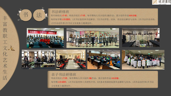 1.书法研修班。书法作为我国独有的民族文化,荟萃了中华民族文化的精髓。书法对于培养人的道德情操、身心素质、智能品性、良好的学习生活习惯、个性塑造及审美能力都有着极其重要的作用。砚湖书院目前开设书法研修班包括周一中午的初级班(将军路校区)、周三中午的中级班(将军路校区)和周五中午的初、中级混合班(明故宫校区)。每个班级的12次课程包括1次书法鉴赏和书论解读,7次书法用笔、结体、章法技法解读与实训,2次书法作品训练,1次作品创作和1次书法文化现象主题课创作。每学期课程结束后,参与学习的教职工可以创作出至少2幅书法作品。目前在书法研修班学习的教职工创作书法作品共计950余幅。