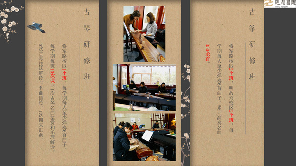 4.古琴研修班。砚湖书院的古琴研修班在周四中午的初级班(将军路校区)一个班级。此班的10次课程包括1次古琴名曲鉴赏和乐理解读,8次古琴技法解读与名曲训练,1次期末汇演。每学期课程结束后,参与学习的教职工可以弹奏出至少6首曲子。