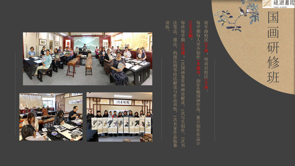 2.国画研修班。砚湖书院目前开设国画研修班包括周一中午的初级班(将军路校区)、周二中午的初、中级混合班(明故宫校区)和周三中午的中级班(将军路校区)。每个班级的10次课程包括1次国画鉴赏和画论解读,1次写生创作,7次书法笔法、墨法、构图法则等技法解读与作品训练,1次名家作品临摹训练。每学期课程开始时,每位参与学习的教职工都会领取一本册页,每学期课程结束后,参与学习的教职工可以创作出至少8幅国画作品。目前在国画研修班学习的教职工创作国画作品共计2750余幅。