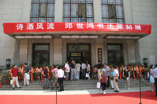 共同主办的“邱世鸿书法篆刻艺术展”,于六月十九日在江苏省美术馆隆重开幕。开幕式由省书协副秘书长李啸主持,开幕式上,言恭达、黄�、陈明震等分别致辞,邱世鸿最后对众多来宾进行了答谢。言恭达、黄�、张训彩、孙晓云、马士达、孙洵等嘉宾为开幕式剪彩。