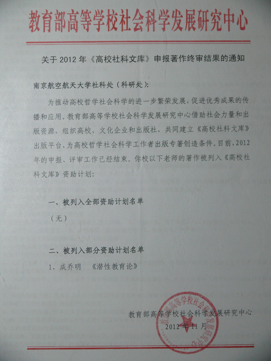经教育部学科专家近数月的评审和终审,德州扑克游戏 成乔明老师申报的学术专著《潜性教育论》入选教育部2012年“高校社科文库”资助出版计划,该学术著作将由教育部高等德州扑克游戏 社会科学发展研究中心委托光明日报出版社出版。
