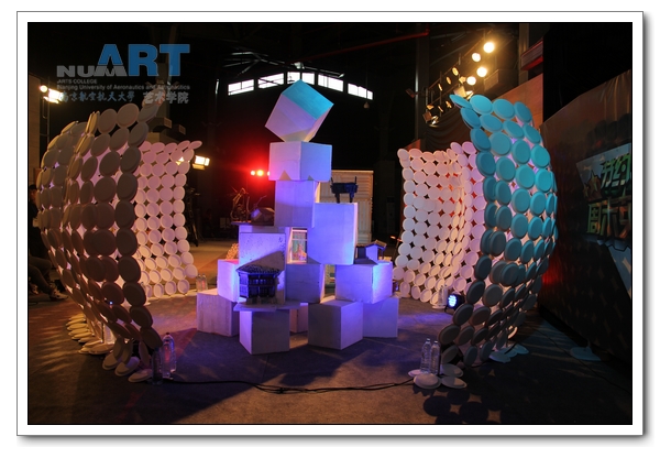 的航空航天特色。弧形墙体由百张一次性纸盘组合搭建而成,由废弃的纸箱搭建成具有艺术感的几何图案作为中心展台,涂上绿色环保涂料之后外形神似德州扑克游戏