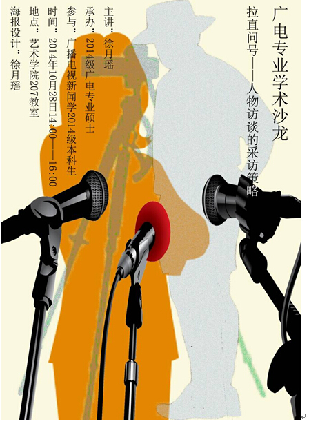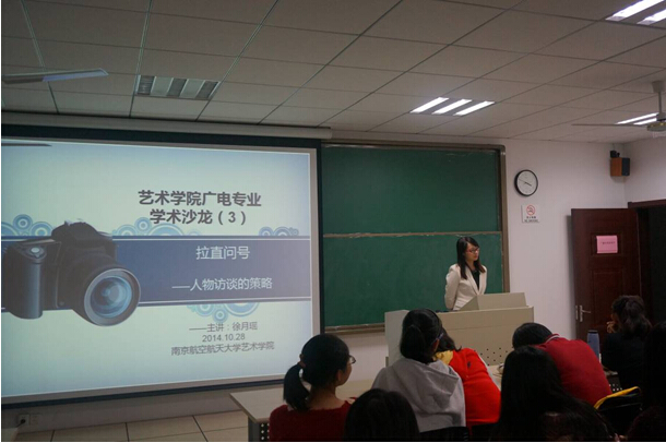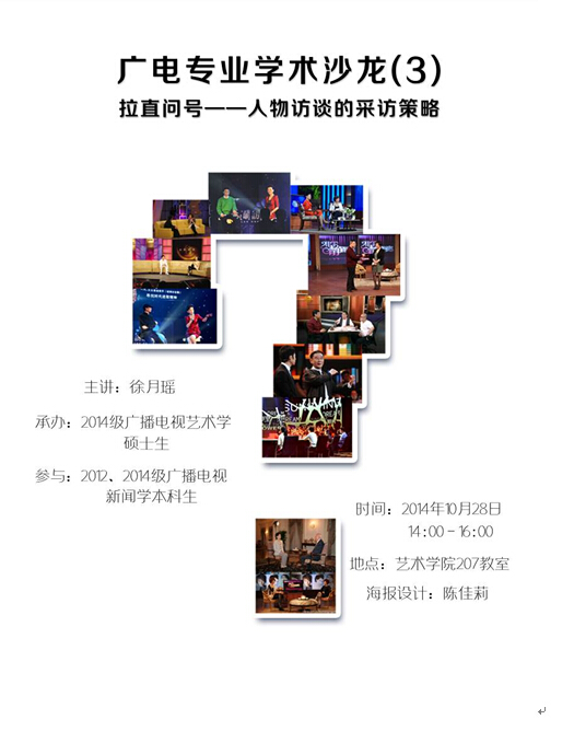 207教室举办,2014级广播电视艺术学硕士生、2012和2014级广播电视学专业本科生聚集在一起,共同研讨人物访谈的策略。2014级硕士研究生徐月瑶同学以《拉直问号――人物访谈的策略》为题,做了主题发言。她结合具体实例,从采访前的准备工作、采访过程中的提问技巧等,总结了人物访谈的策略。