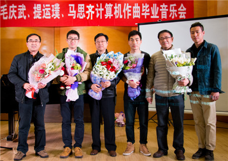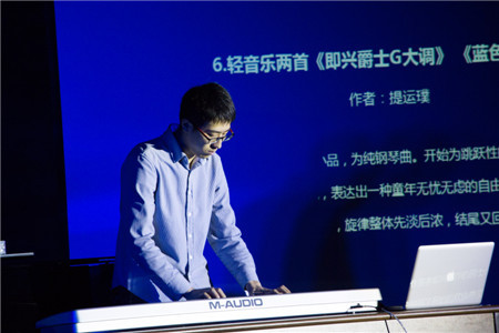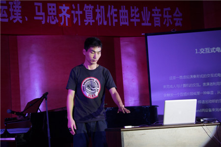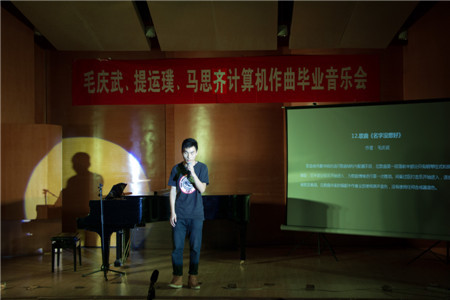 园里的男生、女生之间懵懂、俏皮的想法;作品《即兴爵士G大调》是纯钢琴曲,开始为跳跃性的旋律,中段转为稍带抒情的情感后,又很快的转回到了开始的欢快感觉,表现出一种童年的无忧无虑的自由感;作品《蓝色之空》是一首钢琴加管乐的的轻音乐,钢琴为主要的伴奏声部,木管乐器进行交替式的旋律SOLO,并适当加一些其他的乐器做填充,旋律整体先淡后浓,最后又回归到开始的那种安静的画面,描绘出了雨后初晴,蓝色天空之下的一种宁静;作品《摇摆火车》是一首拉丁爵士风格很浓的电子乐曲,旋律音色采用与传统乐器不同的电子合成器音色,但整体的伴奏风格采用的是以铜管乐为主的大乐队编织。旋律多变化音,节奏大量使用切分音的形式,表达出一种热情感。中间段的钢琴SOLO并没有按照规整的节奏去弹奏,而采用爵士里很常用的即兴手法,表达了一种奔放,热情的舞会场面;作品《心魅》改编自日本著名动漫《龙珠GT》的插曲,重新运用电子音乐进行演绎,此曲整体风格励志向上,表现了即使遇到困难也要坚持不懈去努力的一种内心情感。 马思齐的作品《Highway Rider》表现了高速公路上流动的灯光,匆匆行走在夜色中的人群。隐藏在城市深处的是人们无法压抑的梦想。这首电子音乐采用经典的EDM风格编配,描绘了梦想在人们心中的模样;作品《33》作为跳舞音乐,为了迎合舞者的情绪,在重复循环的节奏中寻找新的元素和变化,并蕴藏着作者对音色的全新设计;作品《Twisted》为仿真弦乐和电子音效而作,是无调性写作手法的习作,为大提琴、小提琴与中提琴刻画了三个不同形象,并交织在一起,辅以电子音效共同营造了充满对抗的纠结情绪;作品《Dark Night》 和《秋叶改编》运用了温暖的电钢琴音色和流行音乐中不可或缺的吉他音乐元素,为听众带来了不一样的听觉感受。 整场音乐会高潮迭起,赢得了观众的阵阵掌声。最后,毛庆武、马思齐、提运璞三位同学分别发表了个人感想,他们非常感谢三年来