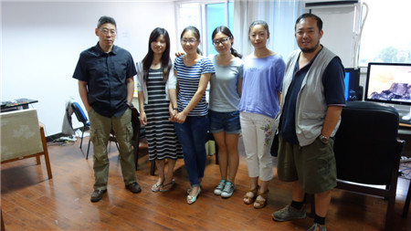 工作人员合影(右一、左一分别为《东方主战场》第7、8集编导欧阳斌、顾翔,左三为《东方主战场》导演助理王燕)