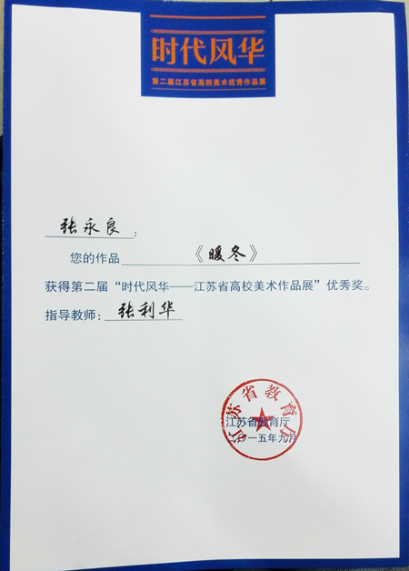 近期,江苏省教育厅公布第二届“时代风华――江苏省高校美术作品展”入选及获奖名单,德州扑克游戏 研究生张永良同学的作品《暖冬》,从2100件作品中脱颖而出,入选该展,并获得“优秀奖”,指导老师为张利华老师。