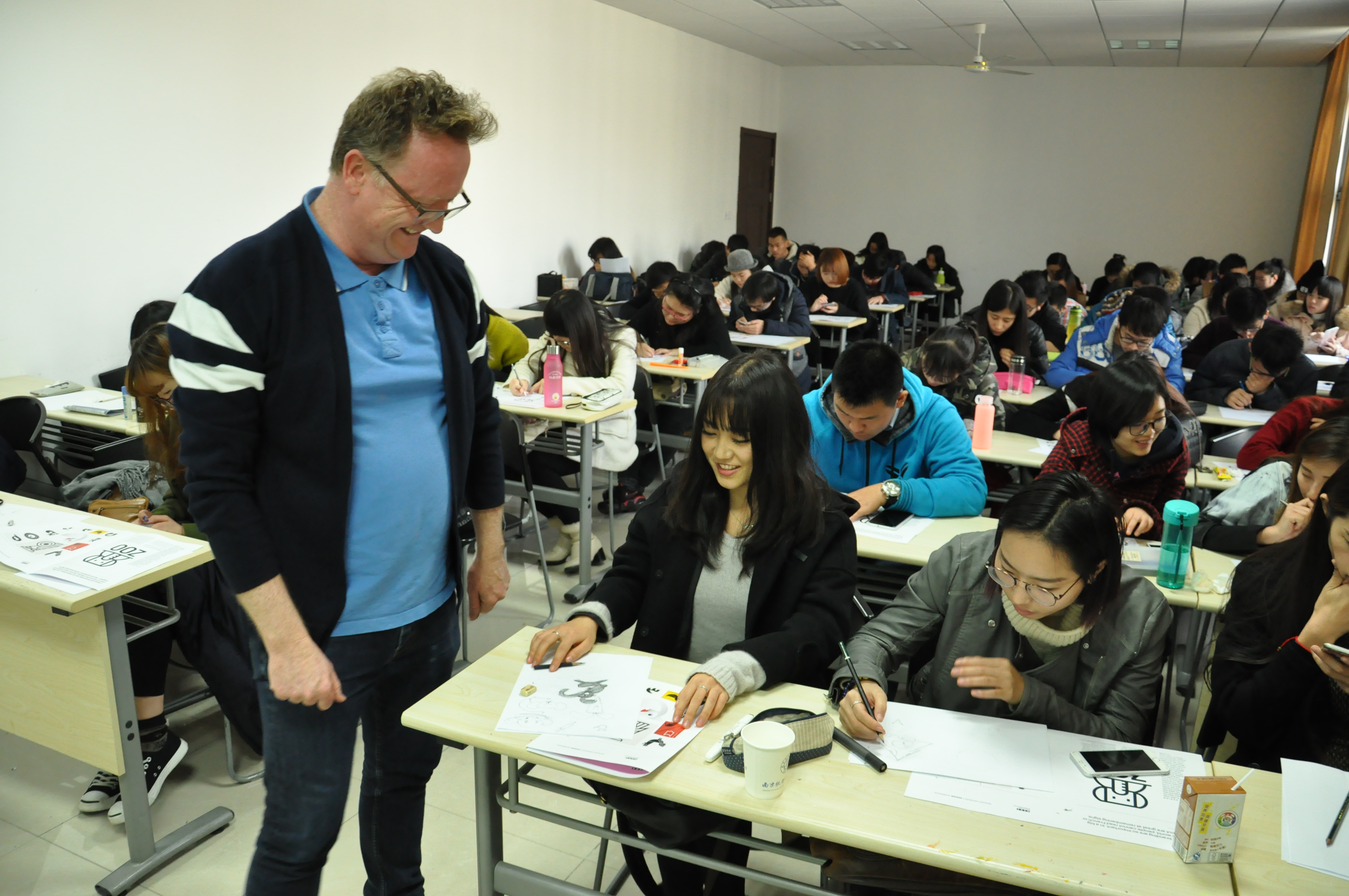 401班的郝世伦同学说:“上外教课的特别感受就在于有更高的自由度,Jim不会给我们提特别具体的要求,他只是告诉你最基本的要求(如主题是动物园,几何图案),剩下的部分会让你自由的发挥。另外,外教上课,十分的幽默,讲课时有不少的“笑点”,上课起来觉得十分的轻松。”