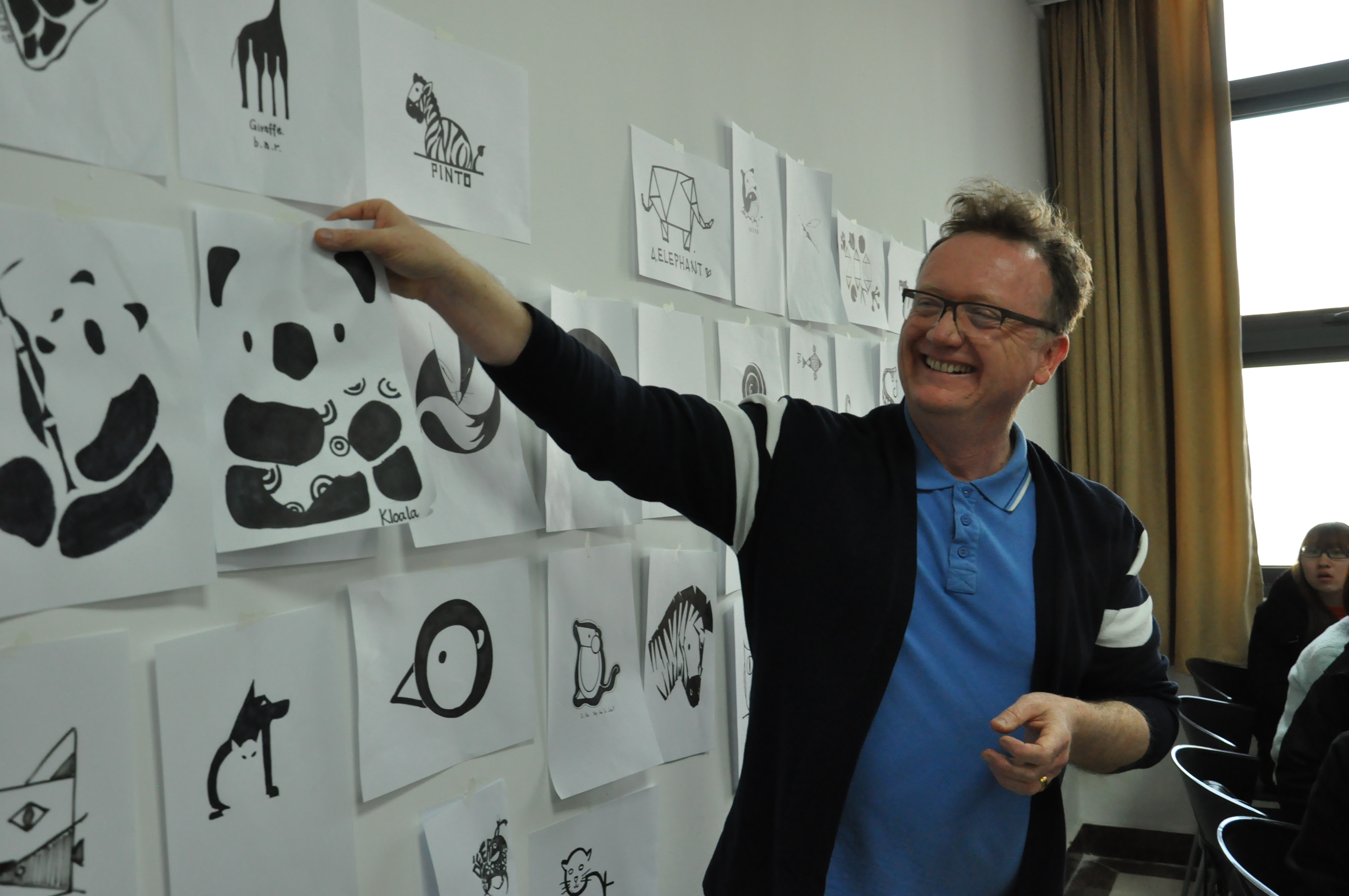 为了让同学们能够感受到LOGO设计的乐趣,Jim让同学们从儿童的角度的出发,省去繁多的细节,运用简单的几何造型画动物,设计出一个动物园的logo。这十分考验同学们的临场发挥和想象能力。以圆形为基础,同学们设计出了憨厚的国宝大熊猫,跳跃的鲸鱼,呆萌的小鸡,聪明的狐狸……Jim将同学设计的logo集中到白墙上,逐个进行比较点评。Jim在教学中非常注重同学们的创作过程以及作品的创意,而不是单纯评价作品,而是看中设计作品出来的实用性如何,有没有达到预期的反响,比如在这堂课中,Jim对那些能够激发起孩子们兴趣的图案赞赏有加,因为这达到了动物园LOGO的设计目的。