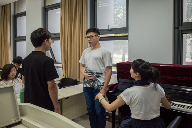 同学们对这门课程的反映也异乎寻常地热烈。起初大家以为邱爱金老师上一两次就不会再来了,当得知老师会陪伴大家完成全部课程计划时都兴奋不已。平时一下课同学们总会积极地向邱老师询问钢琴演奏、歌唱的技巧及控制方法,在最后一节课上,每个同学们上台演唱了自己的拿手歌曲,让老师打分,检验自己通过课程学习在歌唱技巧上取得的进步。两位老师从歌唱表演及控制角度对每个同学给出了不同的建议。课程结束时,同学们对控制以及歌唱都产生了浓厚的兴趣。