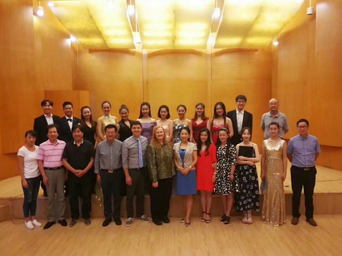 Gayla Blaisdell博士在教学中为同学们规范了歌唱中英语的发声技法,介绍了不同时代欧美英语艺术歌曲的典型风格及发展历史。她通过范唱和积极引导,帮助同学们初步构建了科学的发声观念,规范了学生歌唱中的吐字、咬字及气息运用。面对个别同学在歌唱中的不自信,甚至怯懦回避的问题,Blaisdell教授不断重复着“I can do it, so you can”!帮助同学们逐渐形成了自信而健康的歌唱状态。在完成32课时的课堂教学后,Gayla Blaisdell博士为同学们组织了一场别开生面的音乐会,作为大师班的教学成果向全院师生汇报,音乐会获得在场师生的一致好评。