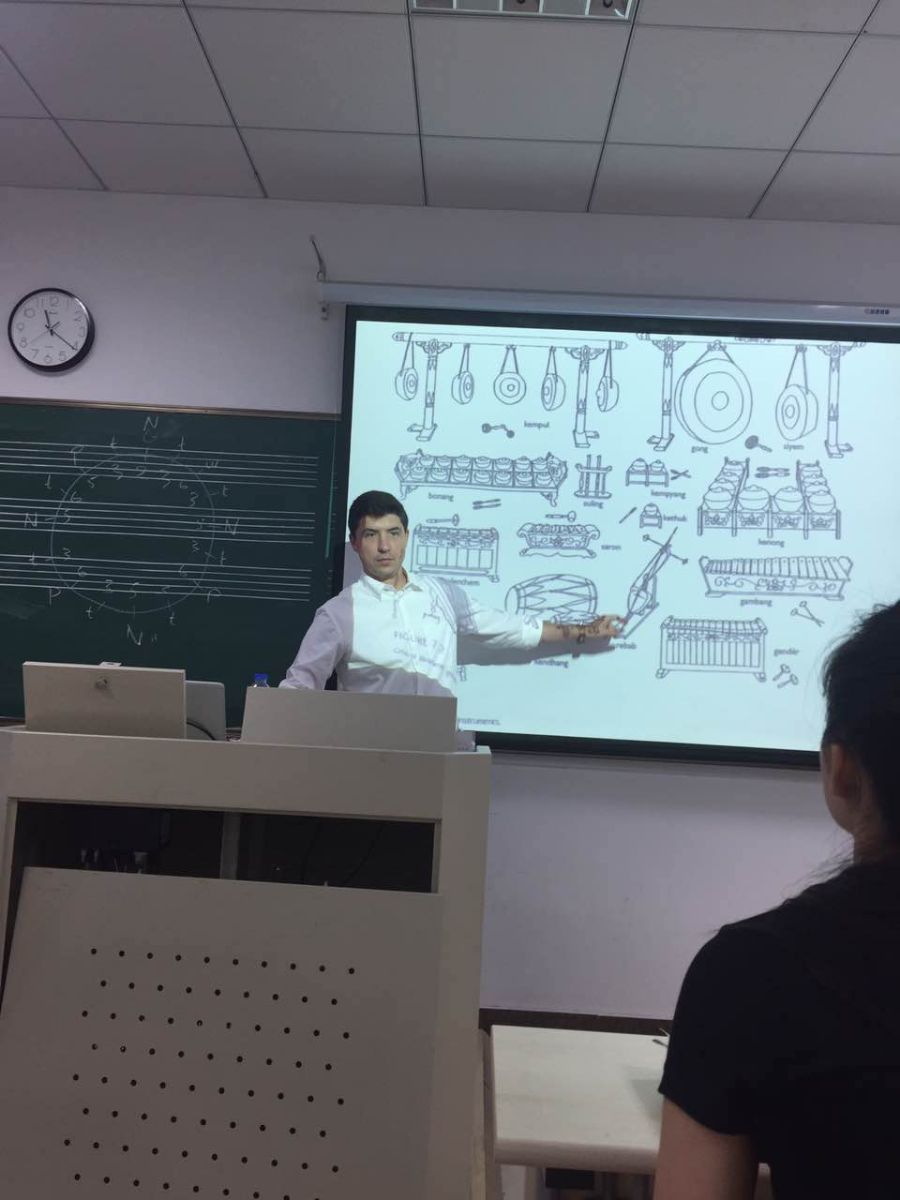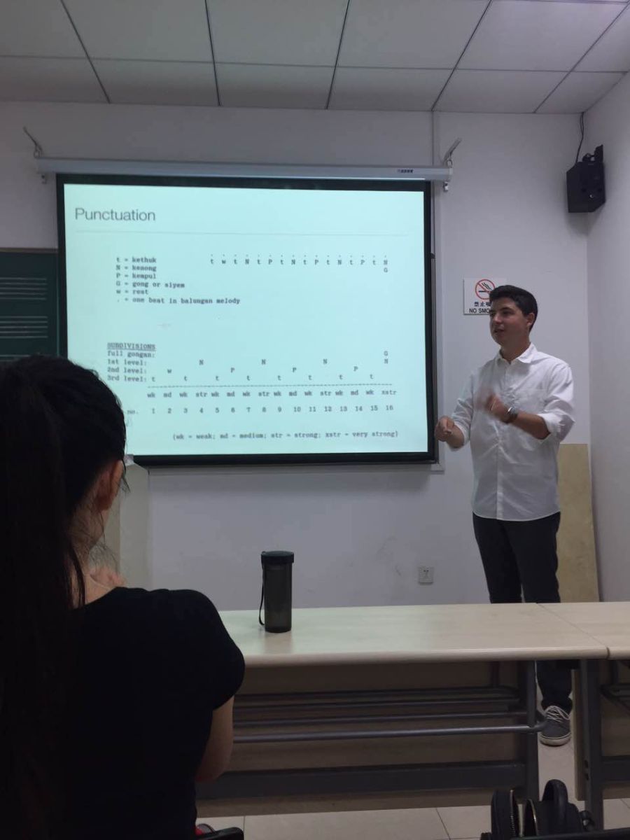 在Mark Samples博士的课堂上,教授为学生介绍了撒哈拉沙漠以南的非洲、美国、印度尼西亚、印度等国的传统音乐,运用民族音乐学学理理论解释和分析了不同文化背景下人们的音乐生活,并与同学们合作完成了极具特色的“布鲁斯”、“爵士”等音乐的即兴节奏实践。教学中,他运用创新性教学理念引导学生进行团体创作,师生以多种节拍组成复合节奏,教室里,节奏声响此起彼伏,错落有致,且能与各自的循环吟唱水乳交融。对于以习练古典音乐为主的大部分学生来说,这种被赋予流行元素的即兴性集体创新模式是那样的新颖,有力激发了同学们的学习热情。