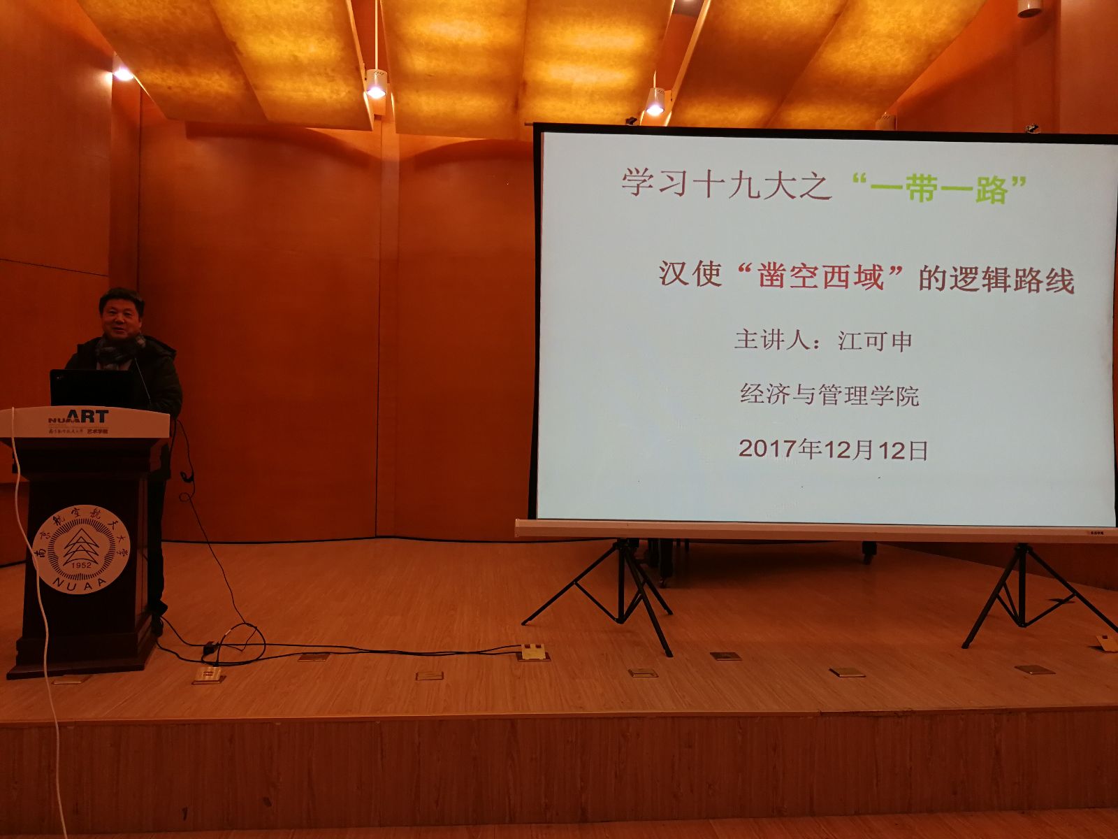 江教授结合前期研究成果,围绕党的十九大精神,从历史和文化等多个维度阐释了“一带一路”的思想起点、历史脉络和战略布局。丝绸之路是起始于中国,连接亚洲、非洲和欧洲的古代路上的商业贸易路线,古代丝绸之路在东西方之间架起了一座政治、经济、文化交往最具象征性的合作桥梁。江教授在宣讲会中,从张骞“凿空西域”、郑和七下西洋的历史典故,到雄伟的万里长城、到数不清的栈道和关隘,把一段段反映中国与亚欧非文明的故事、一幅幅展示古丝绸之路上技术发明传播的岁月图景娓娓道来。他指出,“一带一路”伟大策略的提出,既是遵循历史的逻辑,又是中华文化自信的体现。其思想的逻辑起点,就是开放、包容、和谐、发展,今天的“一带一路”充分依靠中国与有关国家既有的双多边机制,旨在借用古代丝绸之路的历史传承,高举和平发展的旗帜,积极发展与沿线国家的经济合作伙伴关系,共同打造政治互信、经济融合、文化包容的利益共同体、命运共同体和责任共同体。
