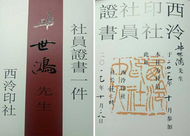 西泠印社是百年老社,在海内外有着崇高的、良好的社会影响。社员入会条件相当严格,十分注意艺术性、学术性的统一,人品与艺品的统一,目前社员仅五百余人。历届社长皆为国内外一流学者、艺术家。其对社员的要求甚高,两名理事推荐,注重创作实力、理论素养、教学经验、协会实践、获奖经历、入展档次、社会影响等多方面,通过理事会讨论通过。此次推荐全国入会者27名,都是各方面成熟、成名的篆刻人才,有着良好的社会形象。