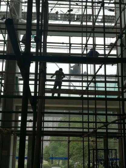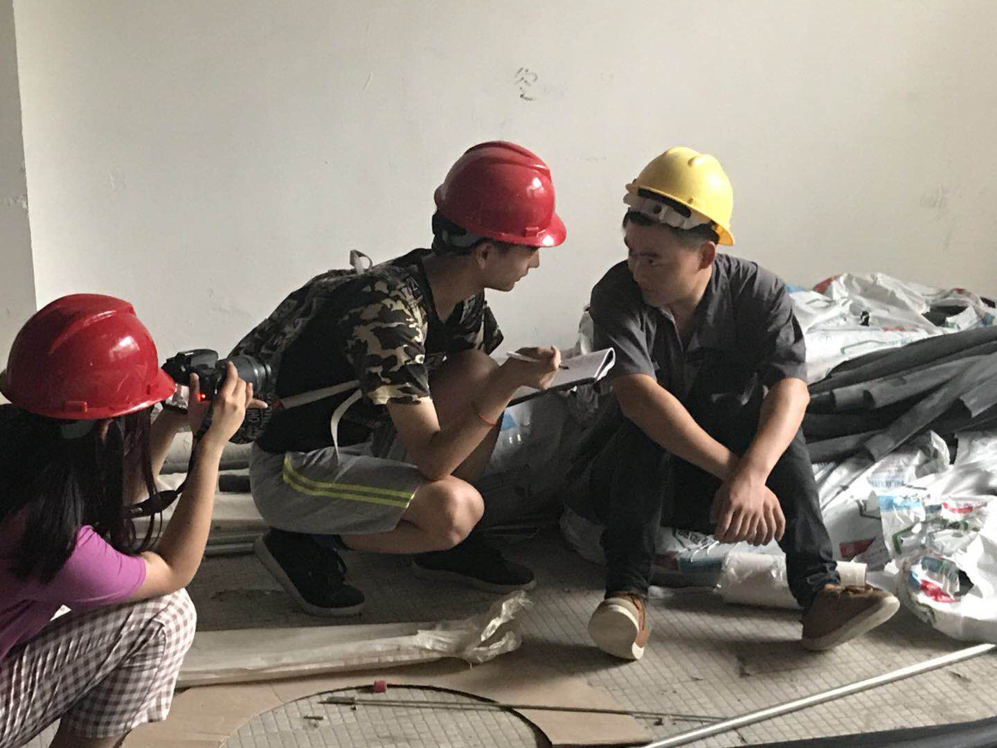 征得工地负责人的同意后,队员们戴上安全帽,在炎炎烈日下,兵分四路相继出发前往四所工地。工地里,机器声嗡嗡作响,工人们身穿工作服,头戴安全帽,到处都是他们忙碌的身影,有的蹲在地上,敲打着钢筋,有的站在高空的架子之上,目不转睛地忙活着,汗水湿透了衣服。
