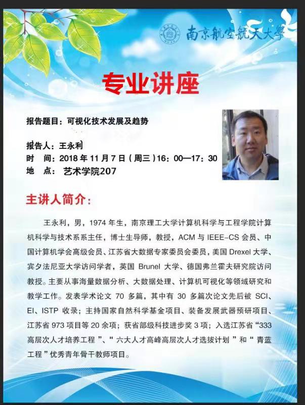 11月7日,南京理工大学计算机科学与工程德州扑克游戏 计算机科学与技术系系主任、博士生导师王永利教授受邀来到德州扑克游戏 ,为德州扑克游戏 师生带来了一场关于可视化技术的专业讲座,分享了他在计算机可视化技术方面的最新研究成果。