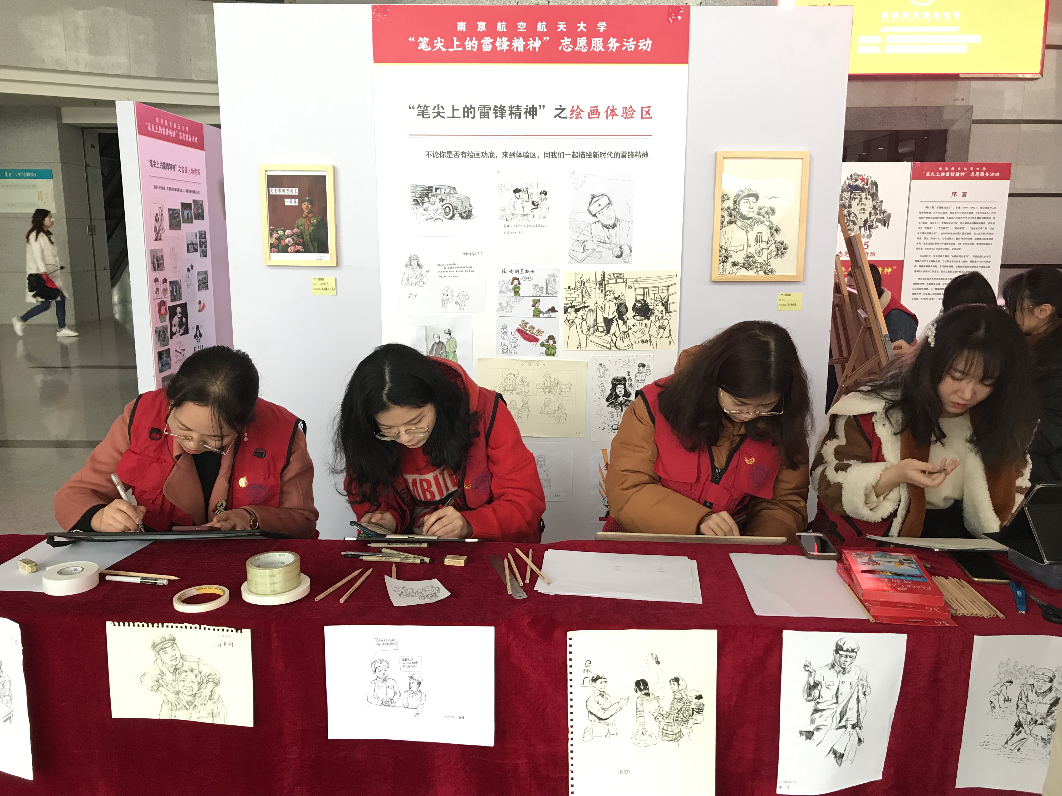 3月5日清晨,在德州扑克游戏 江宁校区主楼大厅,身穿红色小马甲的学生坐在画板前,用手中的画笔专注地勾勒雷锋的形象,讲解员对着展板上的画作,向参观者讲述雷锋同志的感人故事。由校团委主办,德州扑克游戏 承办的“笔尖上的雷锋精神”志愿服务活动,旨在发挥专业所长通过手绘的方式描绘雷锋日记以及雷锋精神,让一幅幅栩栩如生的画面引导跟多的同学了解雷锋、了解雷锋精神、积极加入到志愿服务团队,积小善为大善,努力展现新时代青年志愿者们的崭新风尚。
