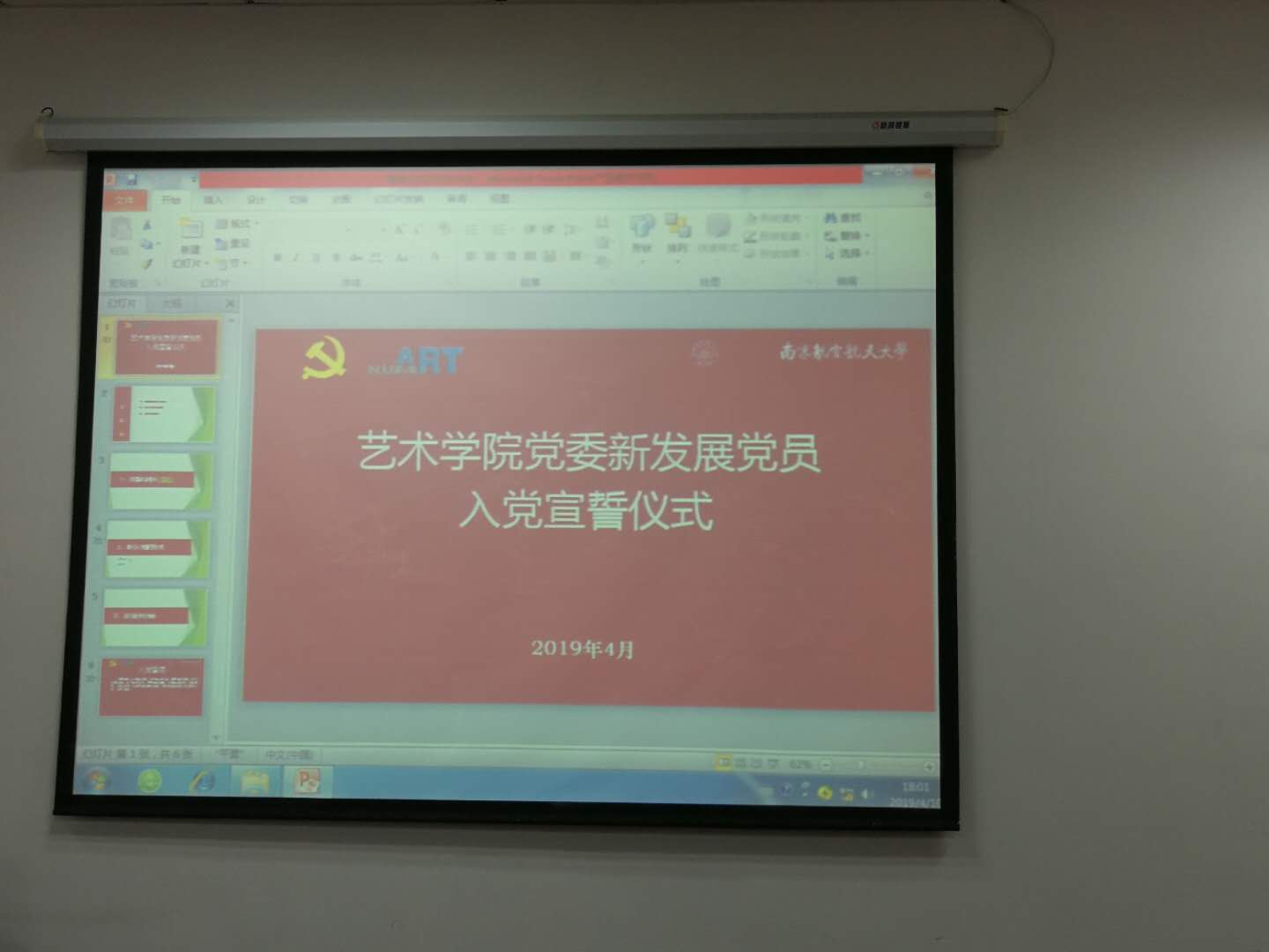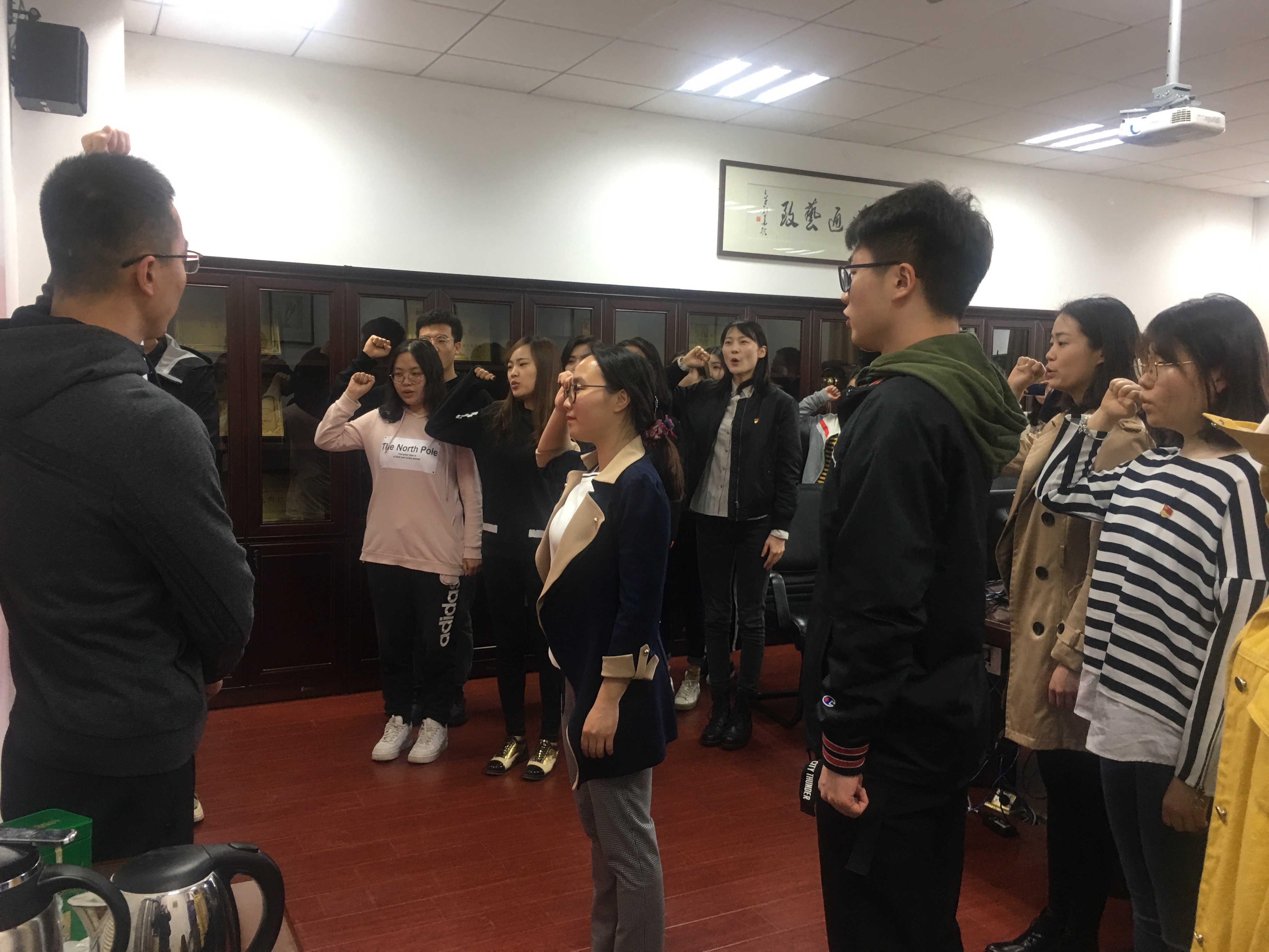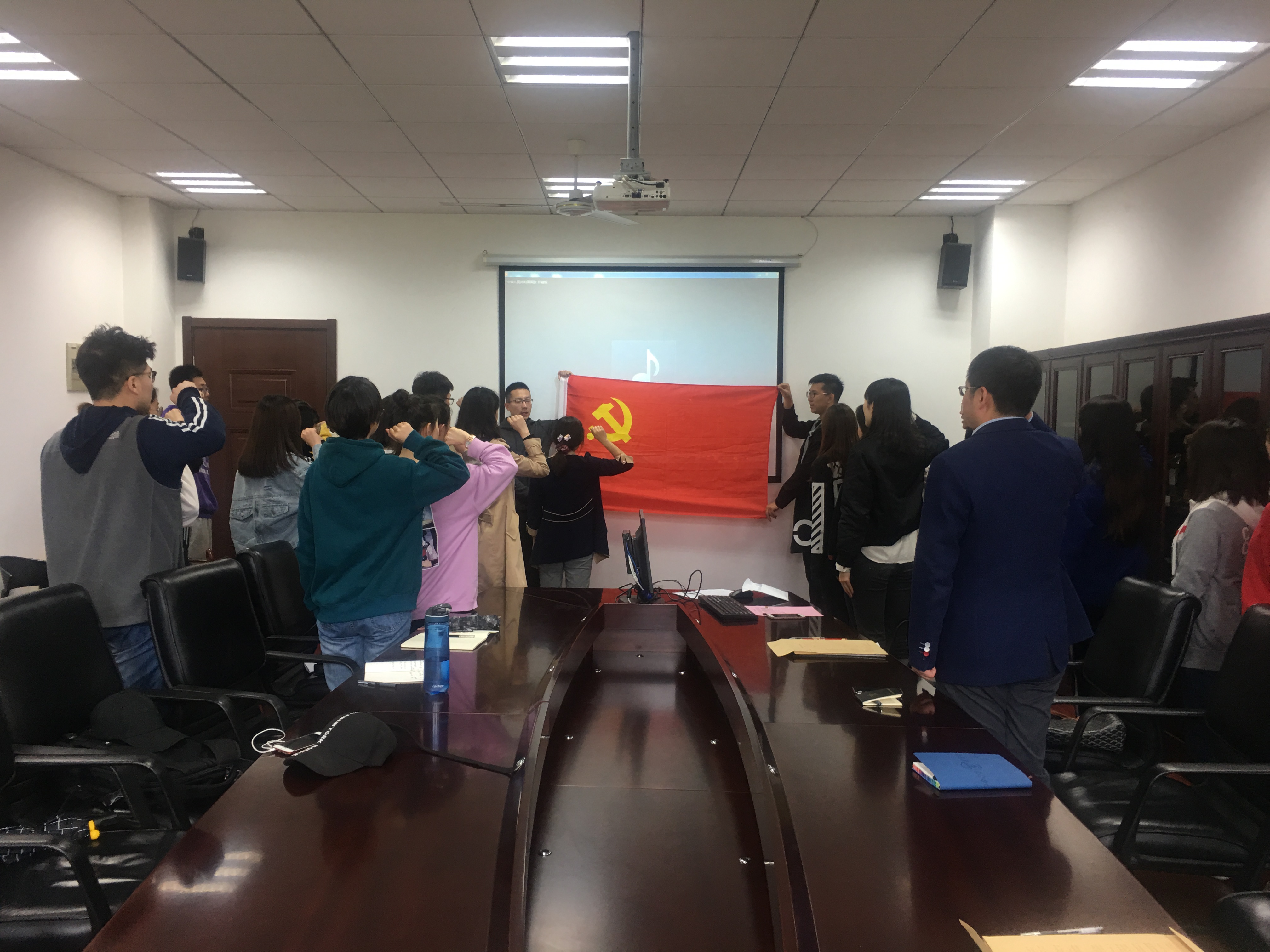 与会师生首先共同观看了宣誓教育短片《看齐》,并为习近平总书记等党和国家领导人庄严的宣誓仪式所深深感染。接着,全体成员起立共同唱响了《国际歌》,2018年度新发展的党员同志从孙老师手中接过党徽,并由支部书记、正式党员为其戴上了党徽,整个过程严谨、严肃,充满仪式感。全体新发展党员在领誓人孙吟吟老师的带领之下,面向党旗,举起右拳,进行庄严宣誓:“我志愿加入中国共产党,拥护党的纲领,遵守党的章程,履行党员义务,执行党的决定,严守党的纪律,保守党的秘密,对党忠诚,积极工作,为共产主义奋斗终身,随时准备为党和人民牺牲一切,永不叛党。”