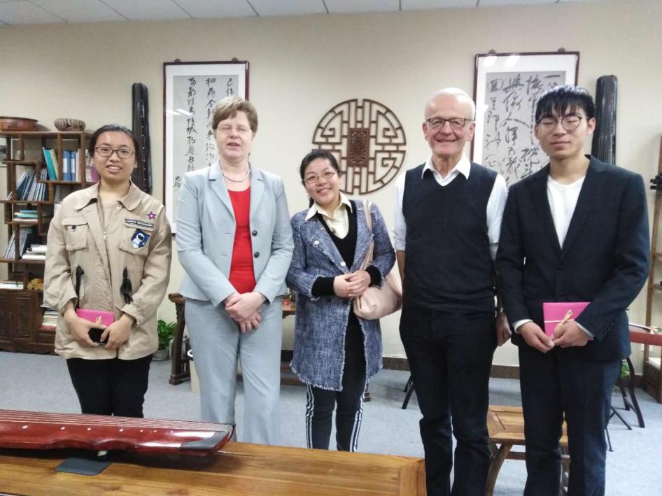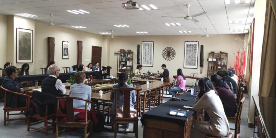 4月12日上午,应德州扑克游戏 老师方璇博士邀请,汉诺威音乐戏剧和媒体大德州扑克游戏 长Rode-Breymann教授和德国图宾根大学Erich Paulun院长Schmidt-Glintzer教授来到学德州扑克游戏 ,与德州扑克游戏 师生在砚湖书院开展了一堂别开生面的教学互动交流课。教学互动交流课上,来自航天德州扑克游戏 的邹助萱和航空德州扑克游戏 的王宁悦两位中国学生向在场的嘉宾演绎了中国传统乐器-古琴二重奏。两位学生通过本学期选修德州扑克游戏 方璇老师的《室内乐演奏实践》课程,在老师的指导下,将古琴传统乐曲《酒狂》进行了重新改编,融合了西方现代音乐特色及技巧,两位同学的二重奏展现出优雅的东方音乐魅力,受到了外宾的连连称赞和一致好评。外宾当场赠予礼物,并邀请两位学生去德国演奏,进行文化交流。两位外宾还与德州扑克游戏 音乐学、美术学、设计学等专业的老师和学生展开了互动交流及学术研讨,气氛热烈友好。板俊荣副院长、邱爱金老师参加了本次活动。