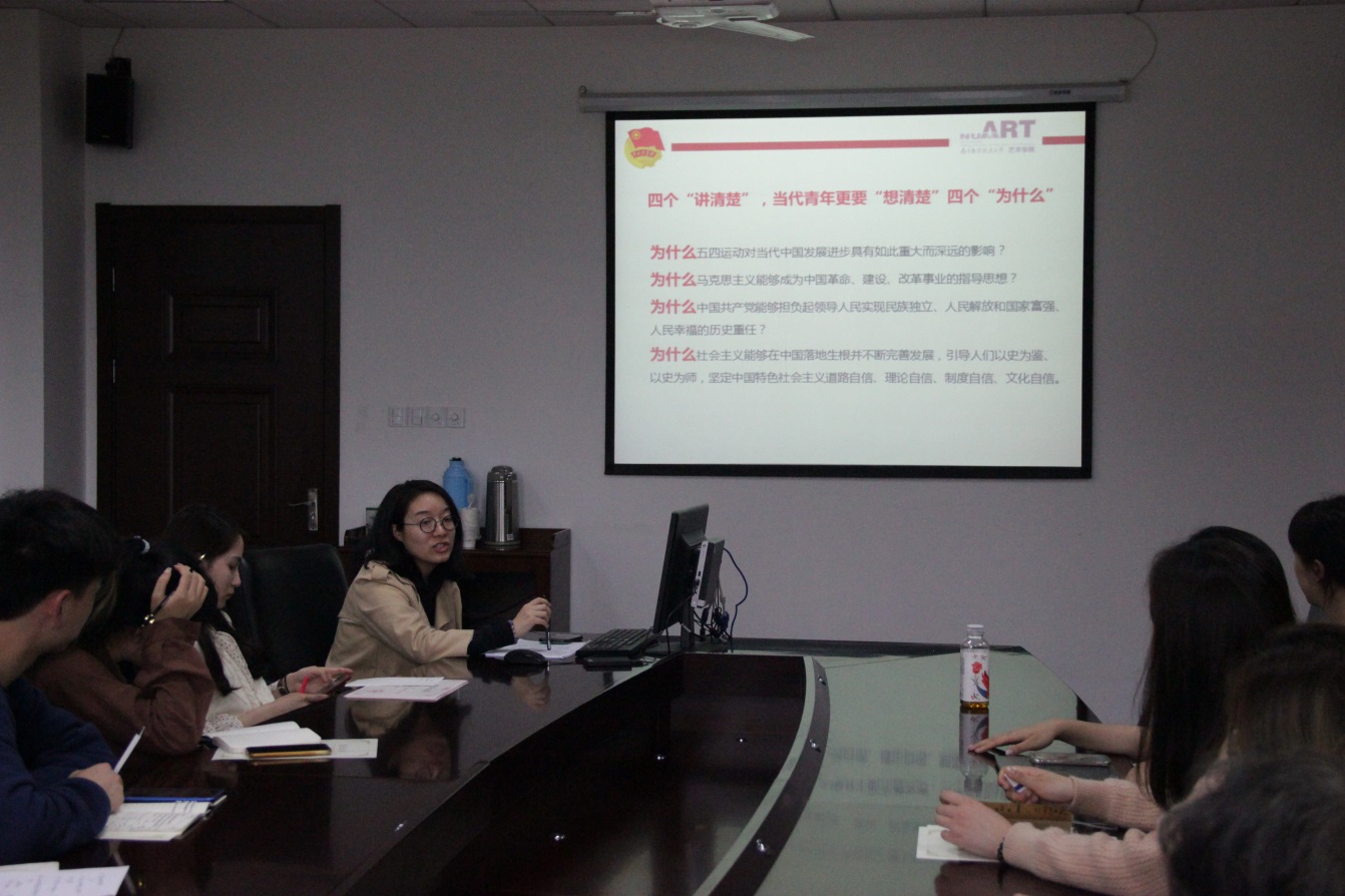 随后,会议集中对习近平总书记4月19日在中共中央政治局第十四次集体学习时强调的“加强对五四运动和五四精神的研究”的讲话内容进行了学习,刘思辰根据自己的学习心得与在座同学进行分享,在纪念五四运动一百周年纪念日即将来临之际,我们作为团干部既要学习这段历史也要深知这段历史对于中国共产党成立以及发展的重要意义,更要坚定理想信仰,将自己的理想与祖国的命运紧紧地联系在一起。