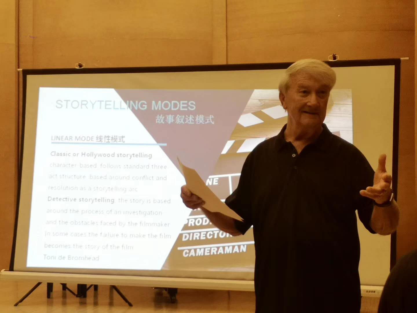 关于纪录片的创作,Roberts教授首先介绍了五种故事叙述模式,分别是线性模式、论述模式、插曲模式、诗歌模式、混合模式。面向众多广播电视学专业的学生们,教授强调了自己在新闻专业的学习为纪录片拍摄的带来的重要影响,“从新闻报道的角度进行纪录片的创作会更重视论述式的故事叙述,注重事实或者是一些信息数据的搜集和梳理。”教授通过自己早期的一部纪录片作品《古巴运动》为大家例证此种叙事模式。