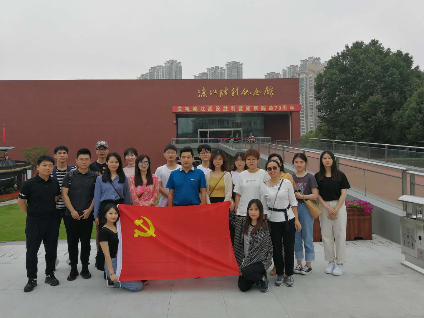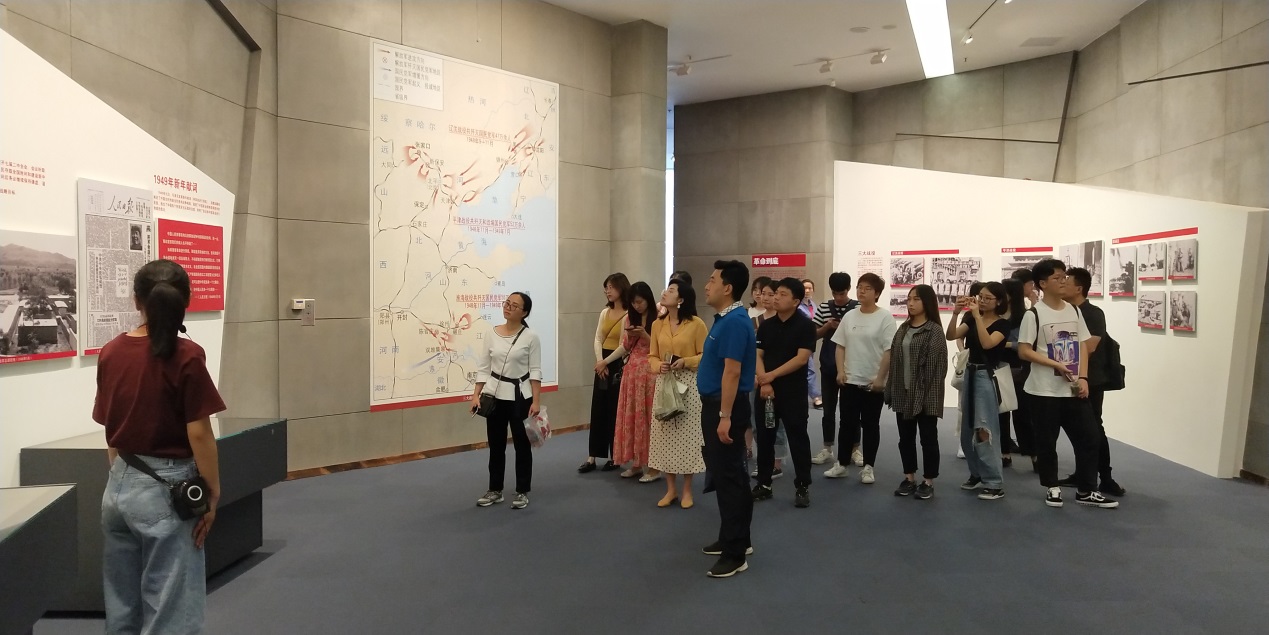 南京渡江胜利纪念馆坐落于长江之滨,是南京城著名的红色地标。整个纪念馆由胜利广场和主馆区两部分组成。胜利纪念广场上6组红色五星组成的群雕尤为引人瞩目,它象征着1949年4月23日南京解放,寓意“钟山风雨起苍黄,百万雄师过大江”的壮观场面。在讲解员的引导下,师生们依次参观了主馆区“渡江战役前的国内形势”、“将革命进行到底”、“百万雄师过大江”、 “把红旗插遍全中国”等四个展厅,一边凝神观看视频资料,一边认真倾听史料实物讲解。由这些珍贵的实务陈列和视频音像资料构筑的时光列车,生动再现了渡江战役“千帆竞渡过长江”的壮烈场景,展现了中国共产党和中国人民为寻求真理进行艰苦卓绝的斗争,充分说明了中国共产党的领导是中华民族的历史选择。