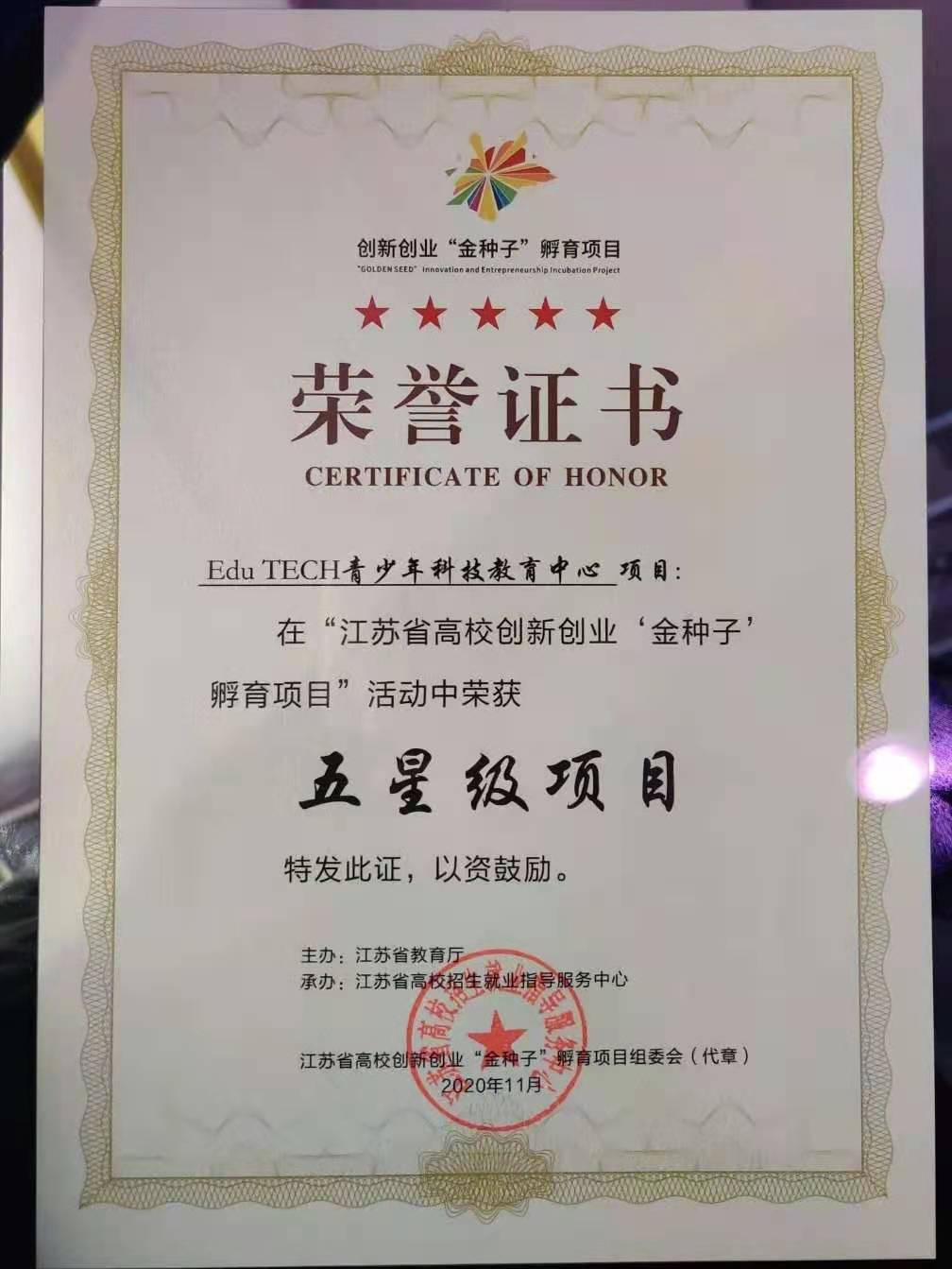 11月28日,由江苏省教育厅主办,省高校招生就业指导服务中心、扬州大学承办的全省高校创新创业“金种子”孵育项目颁奖仪式在常州举行。德州扑克游戏 “Edu TECH青少年科技教育中心”创业项目获评五星级项目,并被授予“金种子”称号。