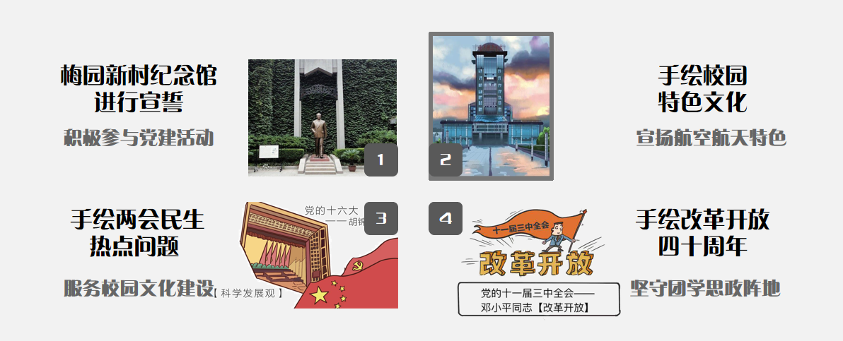 当我第一次用画笔记录下梦想公开课的笔记,信仰就开始萌芽与生长。带着画笔,我撰写了“心中的思政课”微电影剧本,荣获一等奖;参与到“军工记忆”大型专项实践,描绘航空航天人的责任和担当;着手改革开放四十年,用画笔记录下新中国几代人的奋斗和信仰。从不解到聆听,从相信到坚定,我从专业首批党员到党员学导,画笔勾勒出了我的信仰。