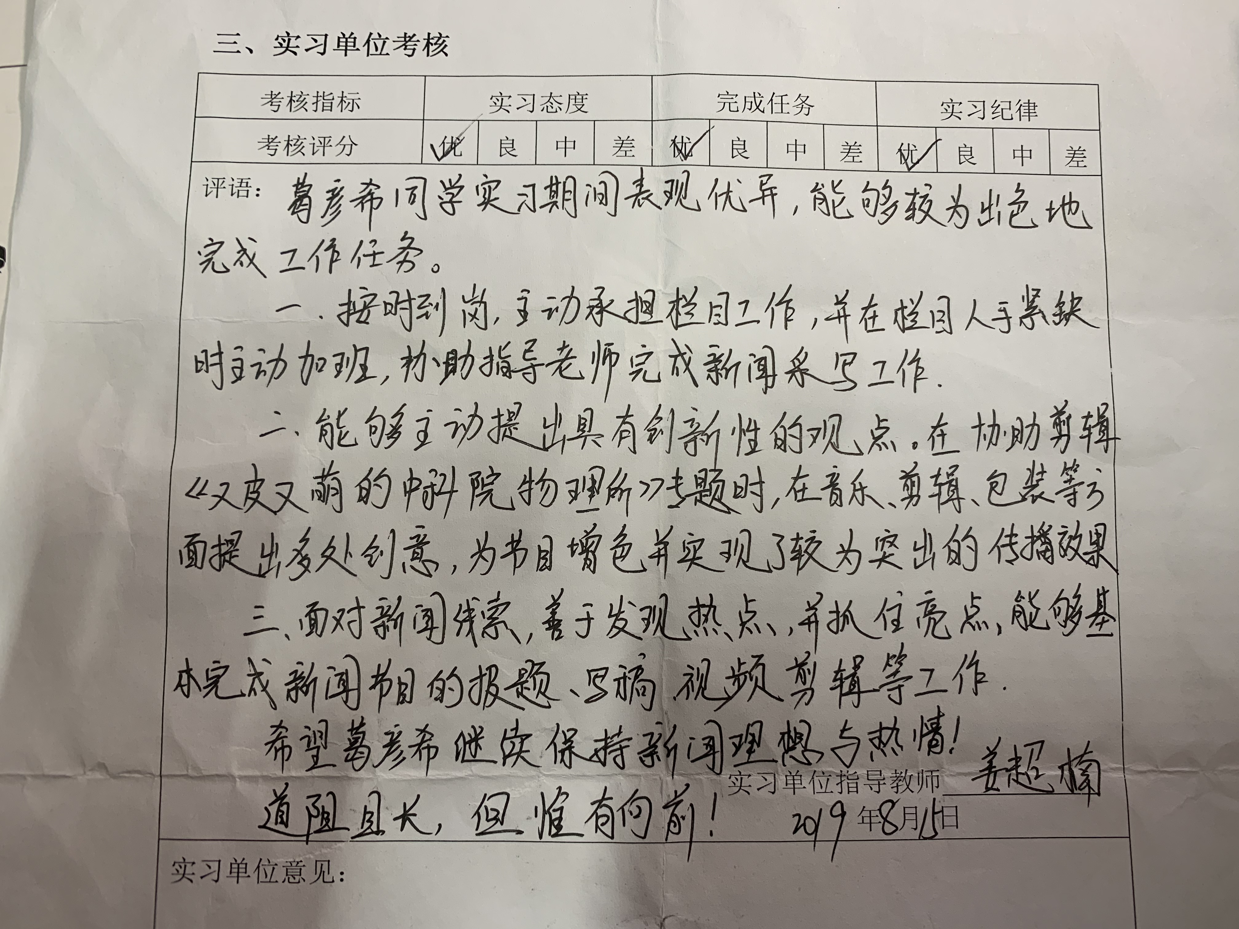 我还连续两年暑假进入江苏卫视进行专业实习。期间,我独立完成了近30条新闻并在江苏卫视播放;我担任了近10场直播的导演,得到了老师们的一致认可。我参与制作的专题片《又皮又萌的中科院物理所》被人民日报等多家国家级媒体转载,被中央网信办全网推送。目前,我正在上海电视台看看新闻Knews担任实习编辑,短短一个多月的时间内,新闻制作量已达上百篇。后期制作中,我经常加班到深夜,在一次次修改,一遍遍斟酌中,我真切地感受到了“新闻人”的责任和使命,发现、记录、探索,关注民生、关注社会,也成为了我坚定的职业理想。