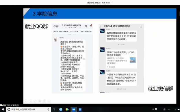 会议中陶老师首先为同学们讲述了就业的概念,向同学们介绍了就业信息网和德州扑克游戏 就业公众号两大网络信息获取方式,并向同学们介绍了使用重点,除了德州扑克游戏 的信息,老师还讲到德州扑克游戏 信息,相关就业QQ群和微信群的存在及作用。
