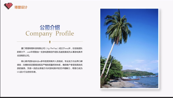 首先,塔普设计总公司设立在厦门。厦门塔普网络科技有限公司成立于2013年。在创作团队的努力下,2016年塔普由一支游戏原画创作团队迅速发展成为从事游戏美术全流程的公司。核心美术团队由从业10多年的资深美术人员组成,专业实力与业界口碑俱佳;完善的项目管理流程及严格的质量把控体系,确保客户享受到高效优质的服务。凭借一流的业务能力与对游戏美术的艺术理解力。塔普已成为CG设计行业的佼佼者。