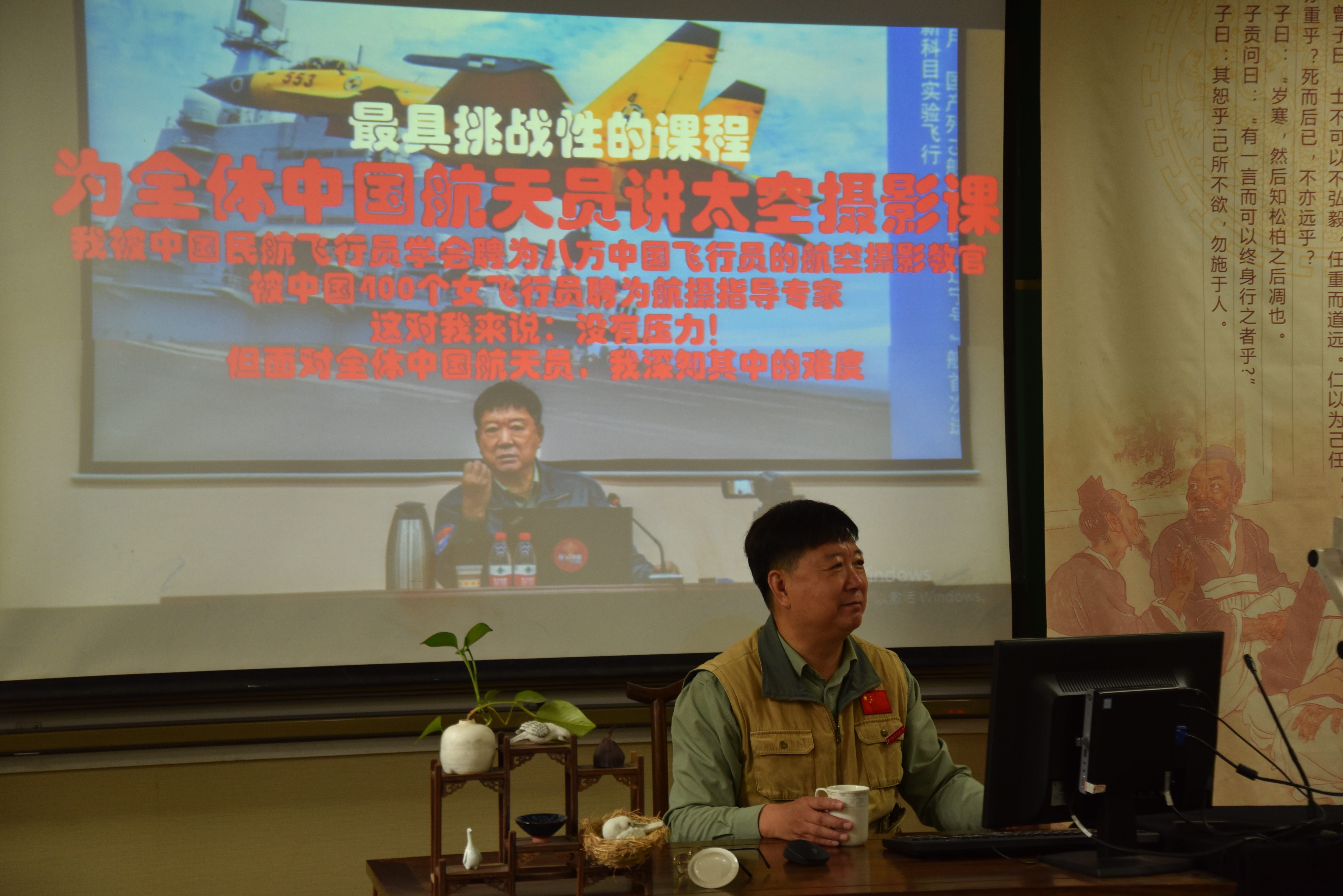 在报告中,牟健为首先谈到了他对影像的理解。他认为,影像是具有强大的传播力和影响力。影像的重要作用不光在于记录还在于要让人们记住。“记住就是一种要求,有要求就有难度,难度来自表现力,表现力产生传播力,传播力产生影响力”。理论的讲述基础上,牟健为还结合他所拍摄的具有较大影响力的照片,如“中国女排获4连冠郎平归来”、“国产新型战机首次南海巡航”、“首次岛礁机场驻训”、“老红军跪谢医疗队”、“公路乎?卖场乎?”等进行讲解,用生动幽默的语言,娓娓道来这些照片背后的故事,让与会者充分体会到了影像的力量,也感受到作为一名新闻专业摄影人应该有的素质:那就是对工作一丝不苟“拼命三郎”精神,不畏困难不畏艰险的大无畏精神,关于社会始终秉持高度责任使命精神等。接着,他从文化角度入手分析了我国和西方摄影视角不同之处,并从六个方面讲解了空天摄影的技艺。他希望同学们要从民族自信心的高度来认识中华航空摄影文化,在实践中强化中国民族的“神箭味”。把艺术、造诣、文化相结合,用影像来诠释民族文化。