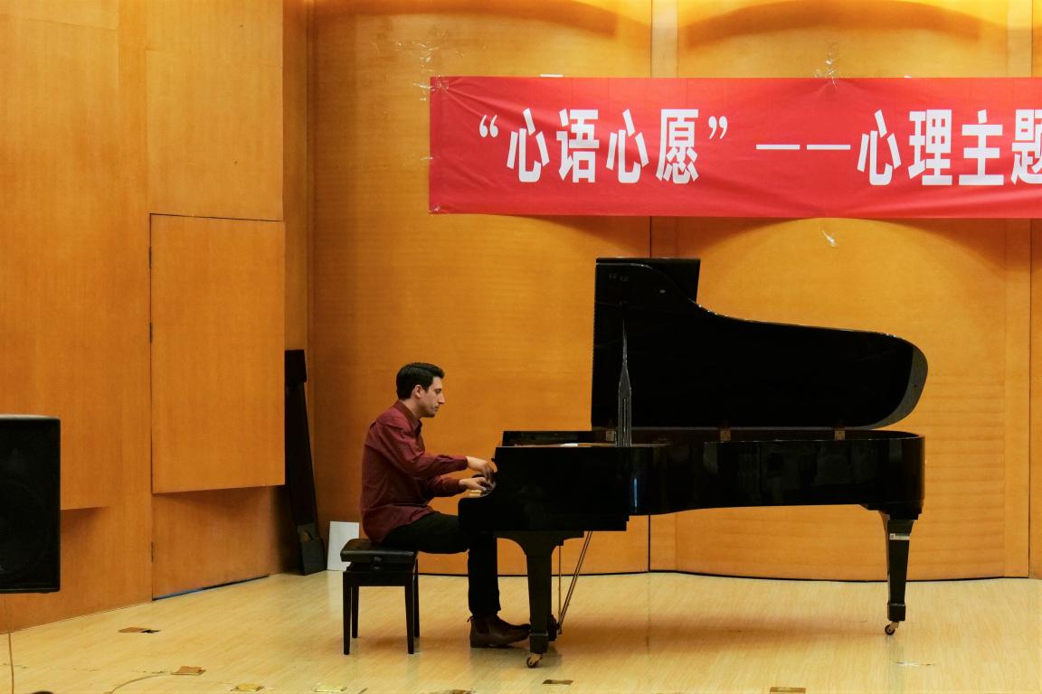 科学表明,音乐具有减压效果,它能够降低疼痛、舒缓压力。音乐系Oscar老师演奏的《月光》就像一段诗篇,把听众带入谧静的深夜,月光如水的美令人感到抚慰。邱爱金老师演唱《军营飞来一只百灵》,活泼欢快的歌声让人感受到力量与希望。两位老师表演结束后,来自音乐表演专业的心理委员戴静同学演奏了一曲《卡农》,悠扬的旋律令人沉醉。