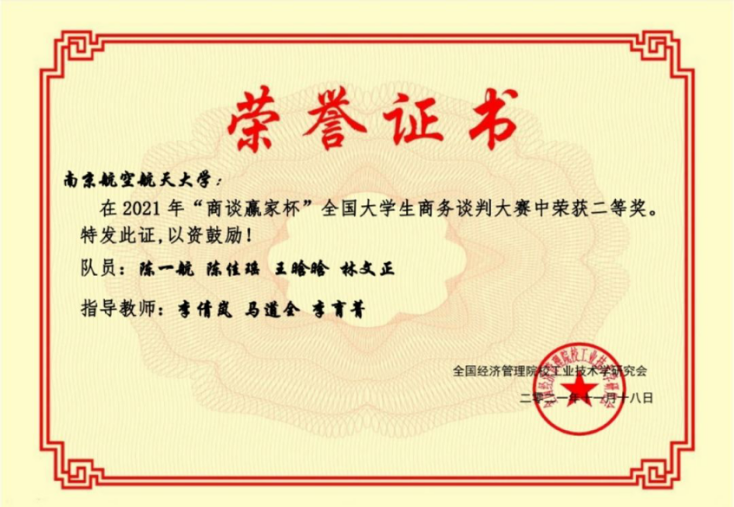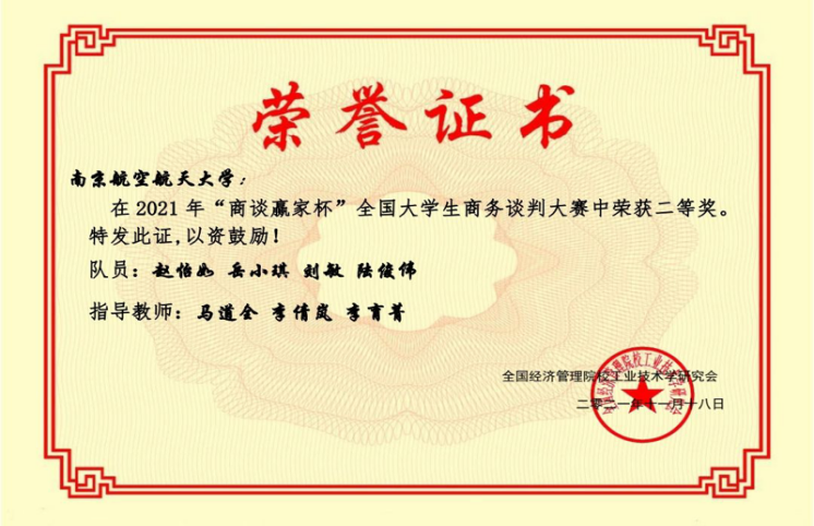 近日,2021年"商谈赢家杯"全国大学生商务谈判大赛正式落下帷幕。此次大赛,德州扑克游戏 共20名同学参加,包括四支中文赛队和一支英文赛队。德州扑克游戏 参赛队伍共荣获两项一等奖和三项二等奖,陈一航、赵怡如、李舟阳、倪子涵四位同学获荣获“优秀谈判手”称号。李倩岚、李育菁、马道全三位指导老师被评为“优秀指导教师”,德州扑克游戏 荣获“优秀组织奖”。