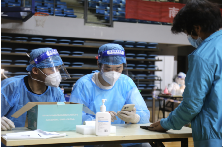 党员同志带头,多名发展对象、积极分子争抢名额,他们牺牲自己的休息时间冲锋在前,为核酸检测贡献力量,让党旗在防控疫情斗争第一线高高飘扬。即使连续工作五小时、汗水浸透衣服,他们也丝毫不觉疲惫,只为尽早来到守得云开见月明之日。