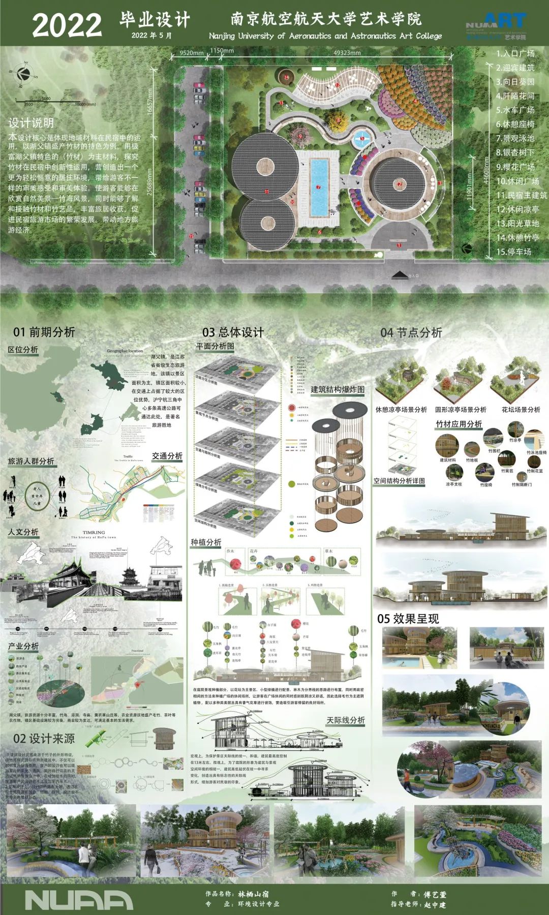 本项目设计核心是体现地域材料在民宿中的运用,以湖父镇盛产竹材的特色为例。用极富湖父镇特色的(竹材)为主材料,探究竹材在民宿中创新性运用,营创造出一个更为轻松惬意的居住环境。在建筑造型上,设计理念来源于被切断的竹筒,不但当地的盛产竹的特点相契合,且建筑竹筒式的造型也呼应了用竹进行设计的总思路。景观规划理念同样来源于竹,将竹的中空且外圆的造型,作为动线设计到景观道路造型上,在寻求多变的情况下也让庭院景观更具有规律感、主次感。同时运用几何学上的理论知识,圆的相切、相重、叠加、以及多种方式并存的方法来进行场地规划。