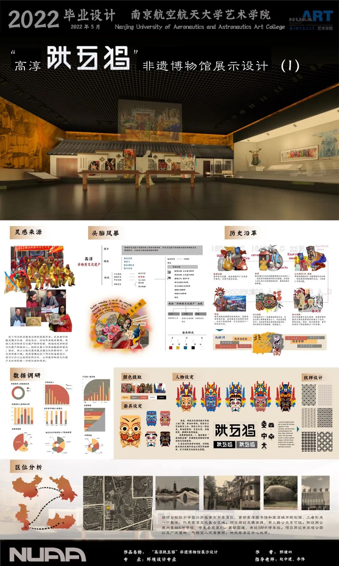 该毕设项目是高淳跳五猖非遗博物馆展示设计。希望能够借此主题弘扬“高淳跳五猖”非物质文化遗产。
