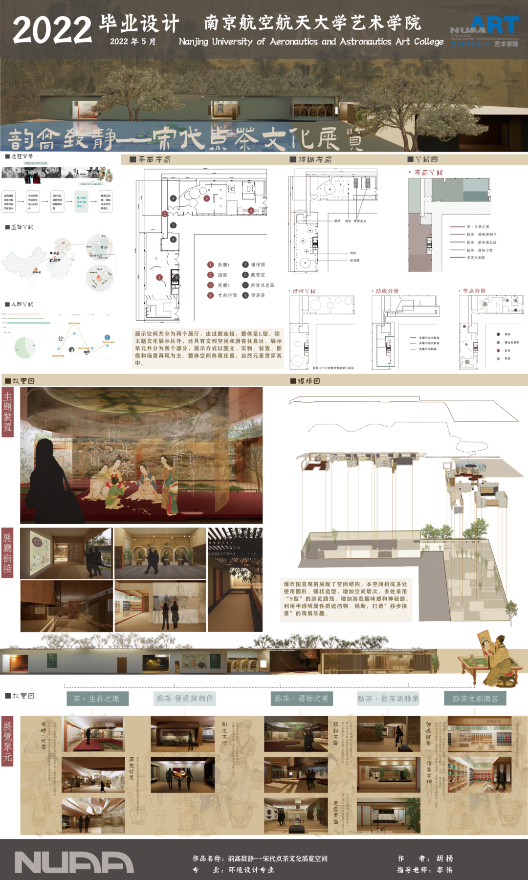 本方案是以宋代点茶文化为展览内容的展示空间设计。本案在传统陈列表达方式之外,通过互动装置,影像,历史场景复刻等功能设计增加展览趣味性。力图传达古朴雅致的点茶文化,展现宋人风雅生活方式。
