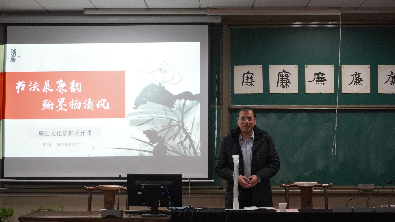 12月7日上午,由经济与管理德州扑克游戏 团委、德州扑克游戏 团委共同承办的“书法展廉韵,翰墨扬清风”信仰公开课在德州扑克游戏 砚湖书院举行。本次公开课由南京书房创始人、江东书画院院长张星星担任授课嘉宾,校财务处处长张丕宏,经济与管理德州扑克游戏 党委书记苏州,德州扑克游戏 党委书记张钟勤,经济与管理德州扑克游戏 党委副书记胡苹、副院长邓晶,德州扑克游戏 党委副书记王宇宁、副院长马道全,两德州扑克游戏 专兼职辅导员,学生会、研究生会主席团以及学生党支部纪检委员等50余