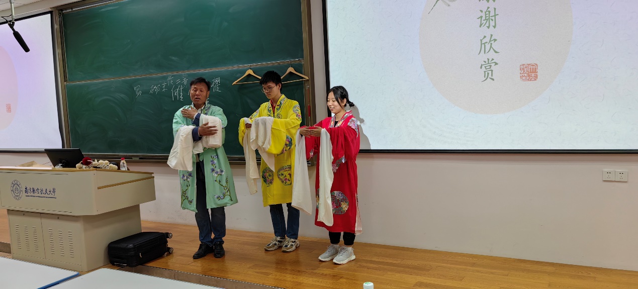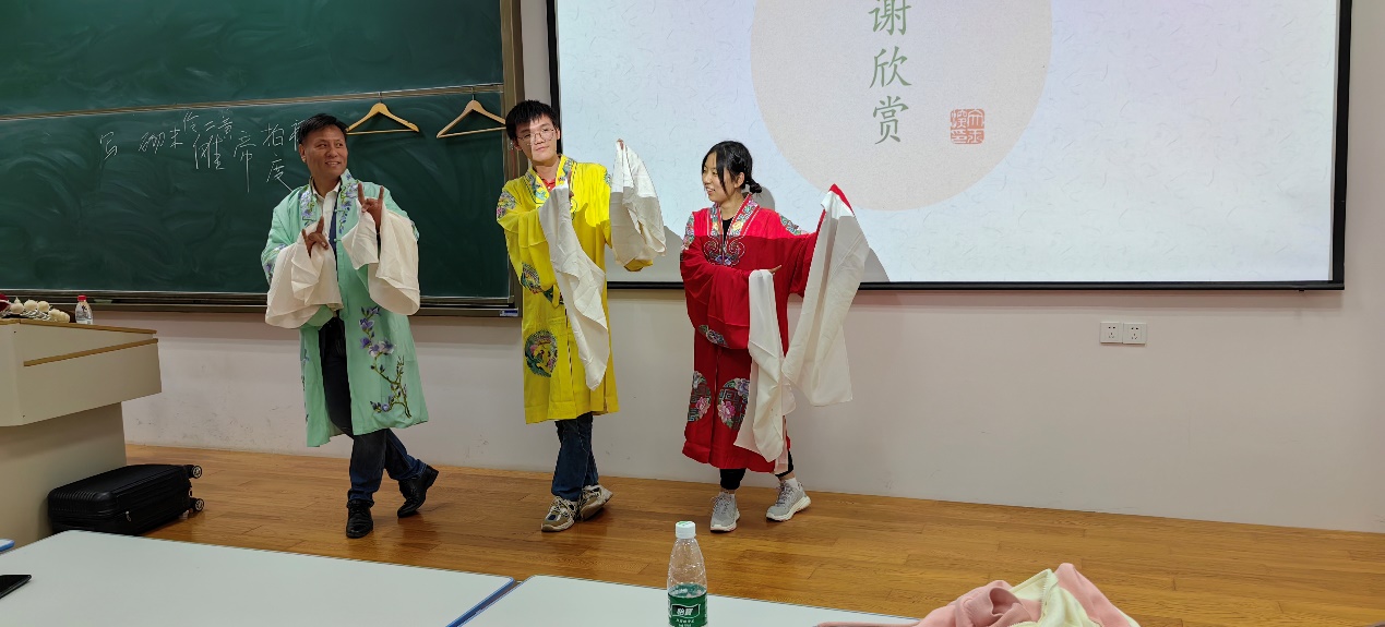 10月27日晚,彭林刚老师在将军路校区5201教室为一百多名学生做了题为“戏曲艺术的视听之美”的学术讲座。他分别讲述了戏曲艺术中唱作念打的基本内涵,介绍了化妆艺术、戏曲服饰及妆扮之美,并将各种表演与声腔、韵白紧密结合。最后,彭老师为同学们展示了戏曲中白蛇的头部装束,介绍了旦角服饰中的“水袖”技巧,同学们参与热情极高。