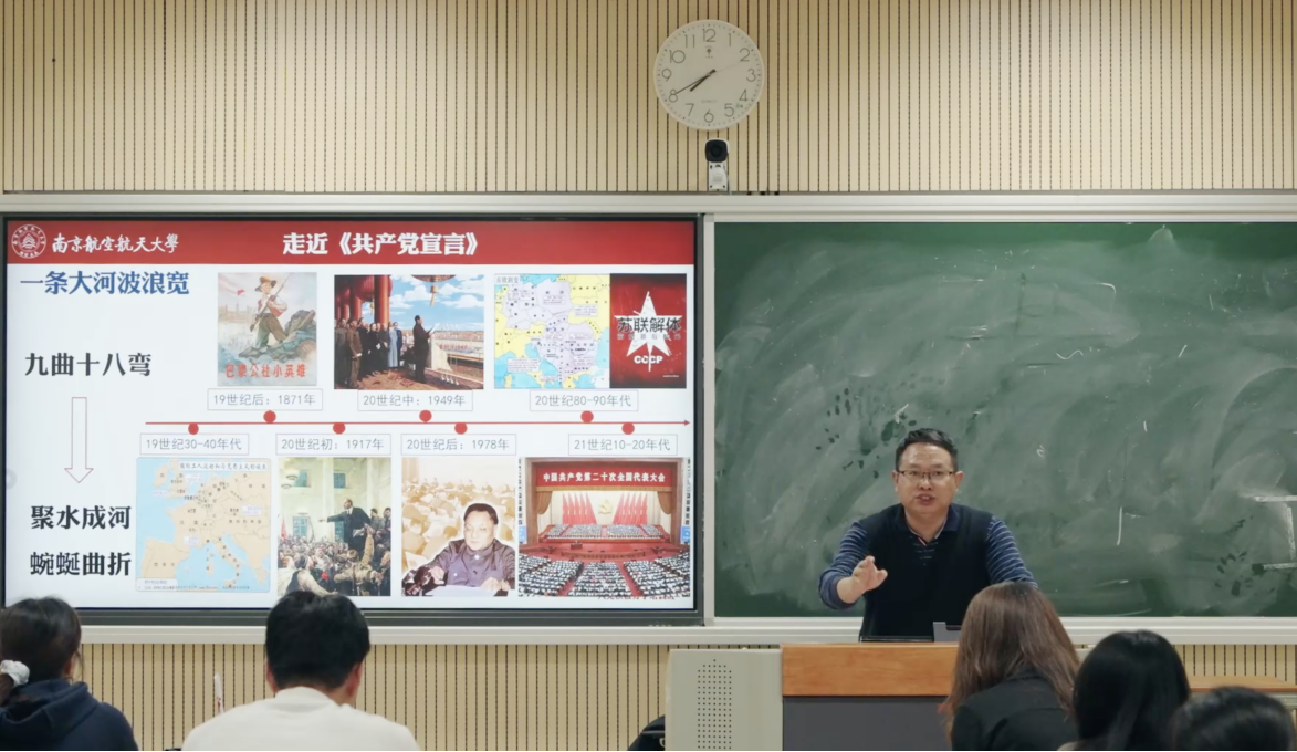 杨波老师从“走近宣言”、“宣言的命名”、“宣言的诞生与内容”、“宣言的关键词”以及“宣言的力量”五个方面为同学们介绍了《共产党宣言》的前世今生。他纵观历史、谈论古今,从中华文明的源头出发,论证了宣言对一个国家的影响是潜移默化的,并从马克思与恩格斯的伟大友谊展开介绍,增进了同学们对宣言诞生的了解。他把《共产党宣言》比作“夜空中最亮的星”,划过人类历史的天空,为世界和中国带来了跨时代的变革。