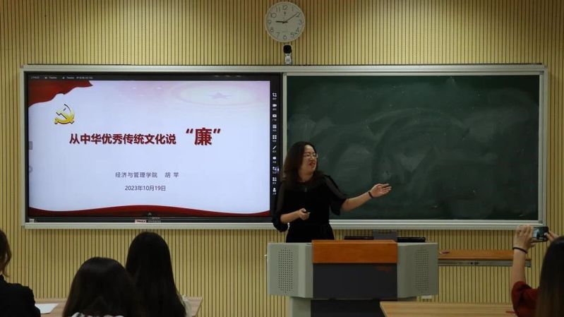胡苹带领同学们学习了习近平总书记对宣传思想文化工作的重要指示精神,从中华优秀传统文化中的“廉”、中华优秀传统廉洁文化中的主要哲学观和中华优秀传统廉洁文化对当今的启示和意义三个方面深入浅出地为大家讲述了中华优秀传统文化中的廉洁文化知识。
