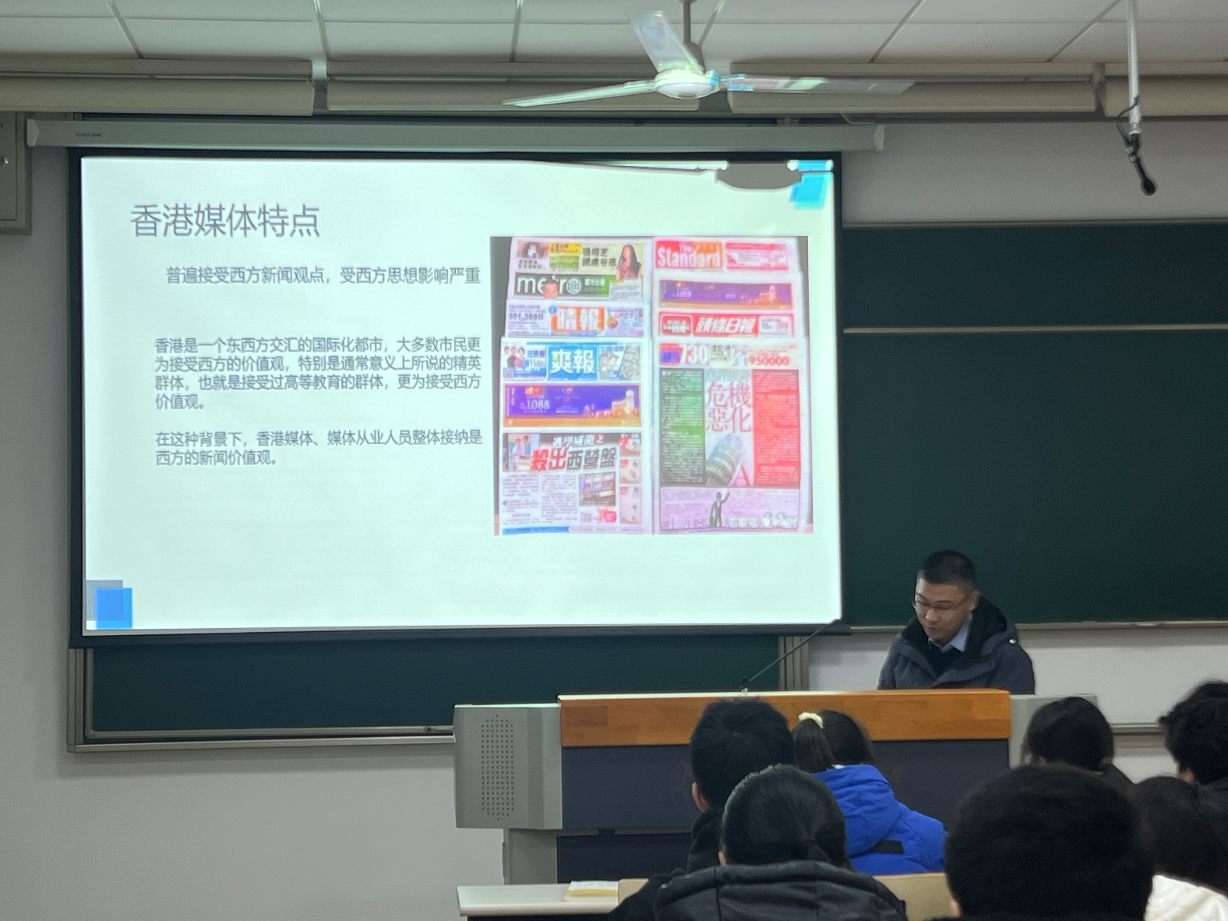 沈伟主编的讲座以“从香港媒体发展谈媒体的全民属性”为主题,首先介绍了香港问题的由来、发展及变迁,然后分享了香港媒体发展的基本情况,接着介绍了香港的特点,包括普遍接受西方新闻观点,受西方思想影响严重;媒体具有鲜明的政治倾向;媒体背后的资本意志;网络媒体发展迅速。最后从香港媒体特点出发,得出媒体发展的启示:媒体不应被资本控制,成为少数利益的喉舌;媒体应坚持为全民服务,不能仅为某一群体服务;媒体应有正确的价值观和导向,不能随波逐流。在讲座过程中,沈主编结合自身在香港媒体工作的经历和相关热点事件,将晦涩难懂的理论深入浅出的为同学们进行分析,引发了同学们的积极主动思考。