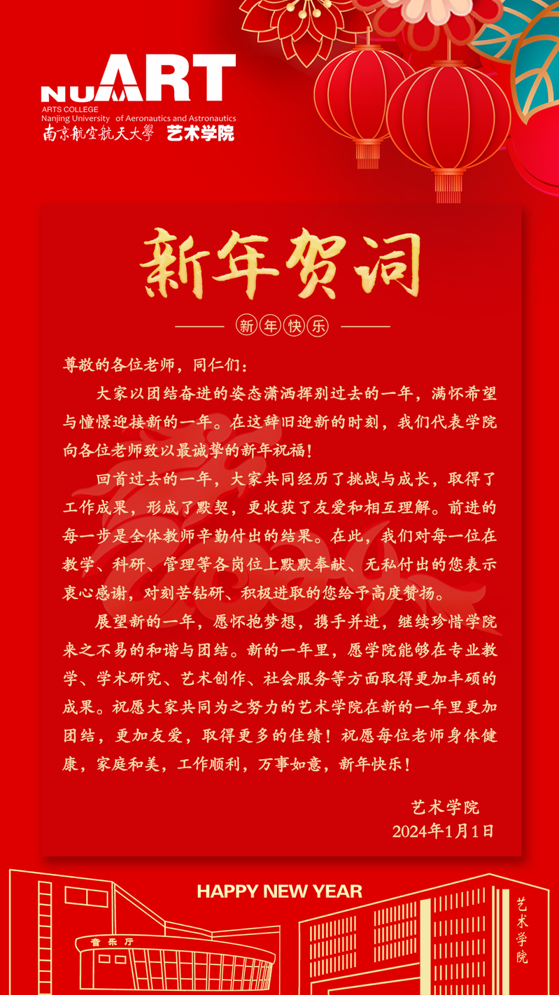 展望新的一年,愿怀抱梦想,携手并进,继续珍惜德州扑克游戏 来之不易的和谐与团结。新的一年里,愿德州扑克游戏 能够在专业教学、学术研究、艺术创作、社会服务等方面取得更加丰硕的成果。祝愿大家共同为之努力的德州扑克游戏 在新的一年里更加团结,更加友爱,取得更多的佳绩!祝愿每位老师身体健康,家庭和美,工作顺利,万事如意,新年快乐!