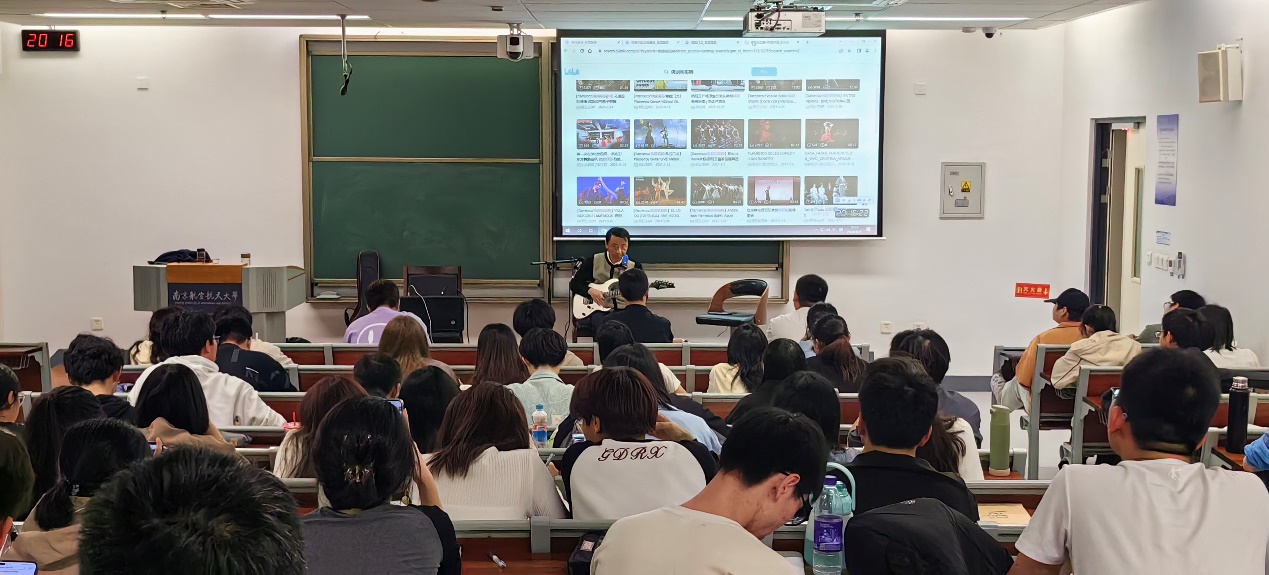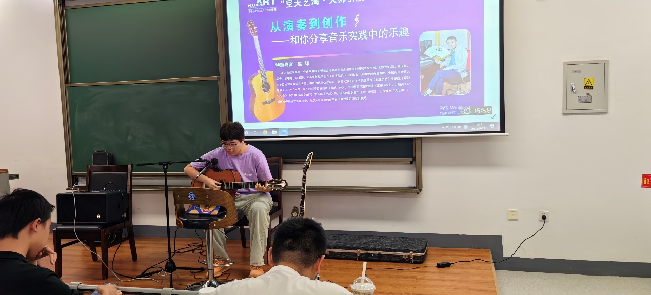 4月23日晚18:45,著名吉他演奏家、作曲家湛辉先生应邀在德州扑克游戏天目湖校区举办了主题为“从演奏到创作”的美育分享活动,深受同学们欢迎。