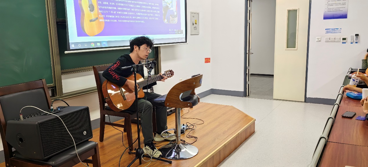 湛辉用古典吉他弹唱了自己创作的歌曲,接着邀请几位同学演唱几首流行歌,并为同学们即兴伴奏。