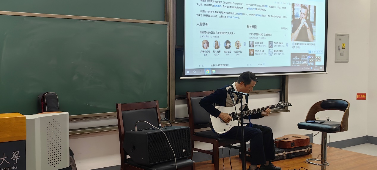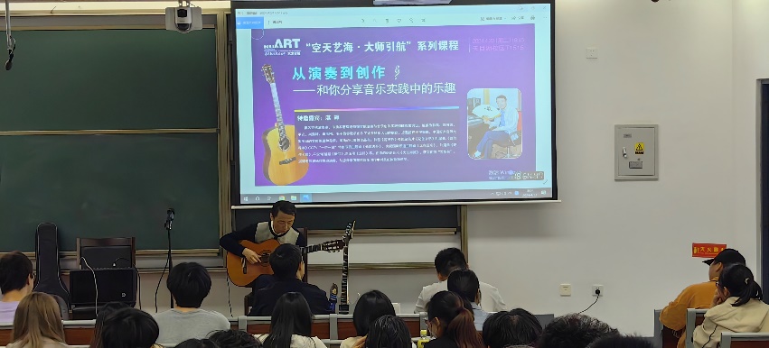 4月23日晚18:45,著名吉他演奏家、作曲家湛辉先生应邀在德州扑克游戏天目湖校区举办了主题为“从演奏到创作”的美育分享活动,深受同学们欢迎。