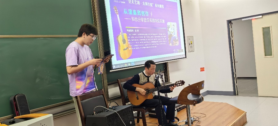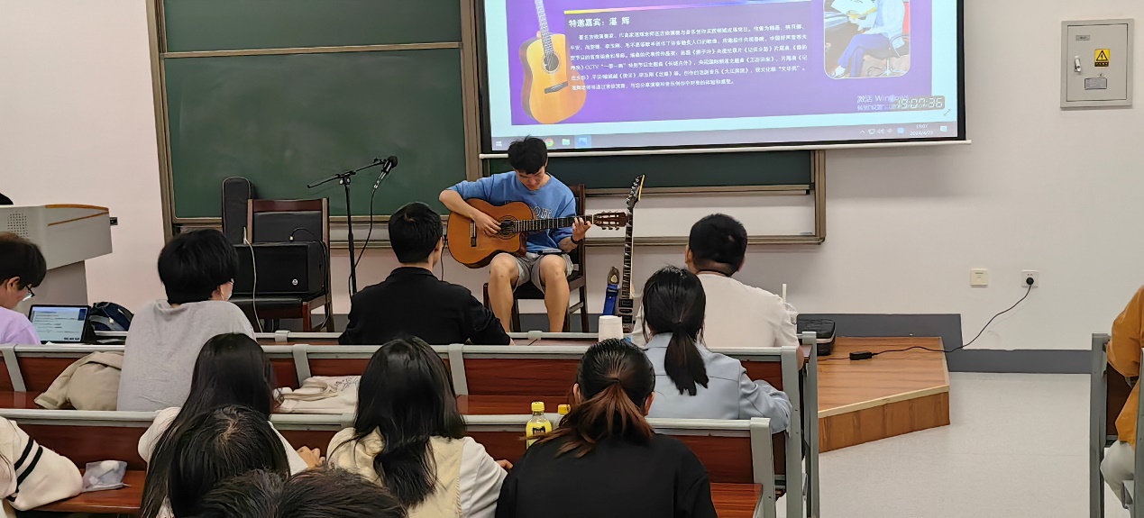 互动活动开始,湛辉为同学们弹奏了《爱的罗曼史》《加州旅馆》等经典吉他曲,接着他讲解了吉他学习的基本要领,之后他还邀请几位同学进行现场弹唱,并鼓励同学们在弹唱的时候要自信,大胆表现。