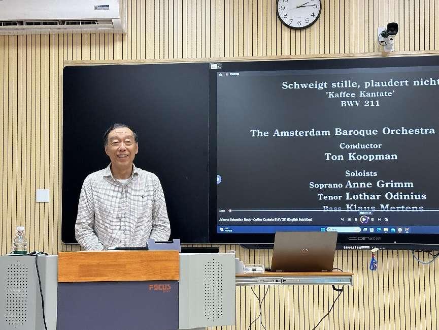 讲座伊始,杨勇教授为同学们播放了巴赫的音乐喜剧《咖啡康塔塔》(The Coffee Cantata BWV 211),让同学们了解了早期西方音乐的特点。杨勇教授通过这部作品告诉同学们巴赫创作这部作品的初衷是为了消除人们在那个时代对咖啡的偏见,因此有了这部音乐喜剧,并由此揭开了德国真正的咖啡文化。
