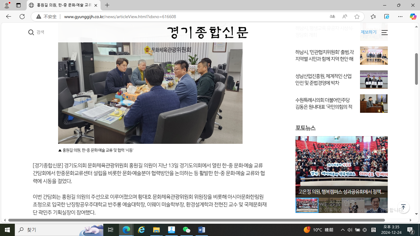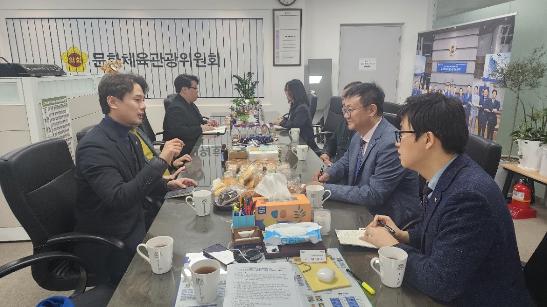 在座谈会上,双方就建设中韩文化交流中心等议题进行了深入的讨论。板俊荣院长对京畿道议会的盛情款待表示了衷心的感谢,并提出了多项合作的具体建议。这些建议包括共同举办国际展览和音乐会、在文化遗产和文化多样性方面进行合作研究,以及加强两国青少年在文化艺术和教育领域的交流与互动。他特别强调了建立中韩文化交流中心的重要性,认为这将为双方的持续合作和相互支持提供更加稳固的平台。对此,黄大浩议员表示了极大的赞同,并承诺将积极与京畿道及其议会的国际交流部门进行沟通和协调,以全力支持双方的合作项目。