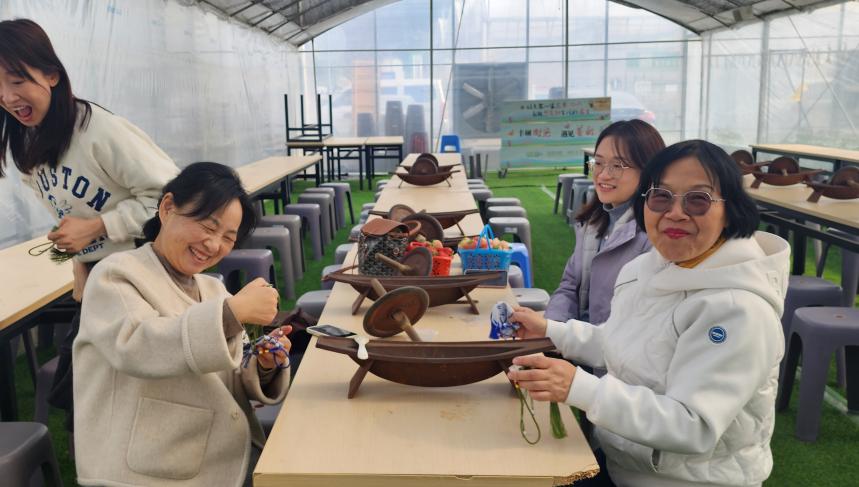 香囊馆内药香四溢,作为农场的标志性场馆之一,教师们在专业人员的指导下,学习了艾叶、藿香、薄荷等中草药的性味和功效,将研磨好的药粉装入香囊袋中。香囊不仅承载着大家对传统文化的热爱,也寄托着对健康的美好祝愿。
